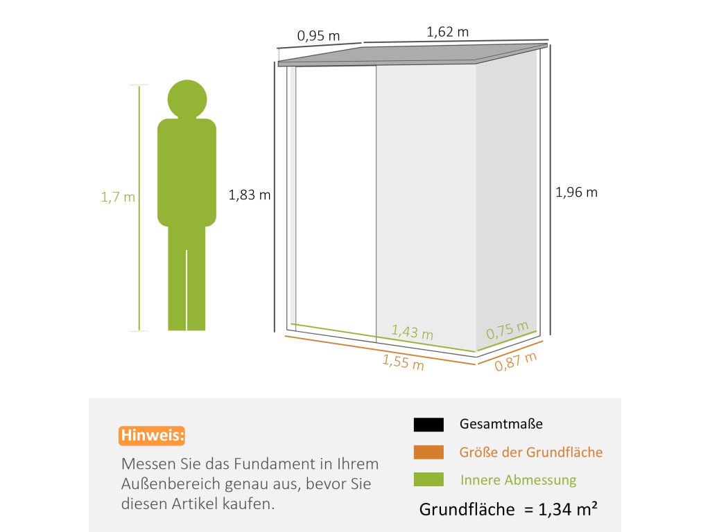 - Rozměry zahradního přístřešku: Celkové rozměry: 161,5 D X 94,5 B X 183/196 Cm, vnitřní rozměry: 142,5 D X 74,5 B Cm, rozměry dveří: 63,5 D X 178 V Cm, bez podezdívky. Nutná montáž.