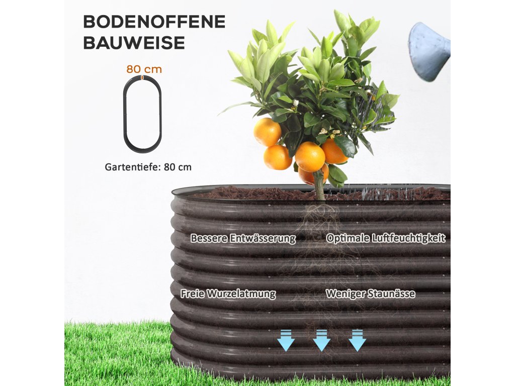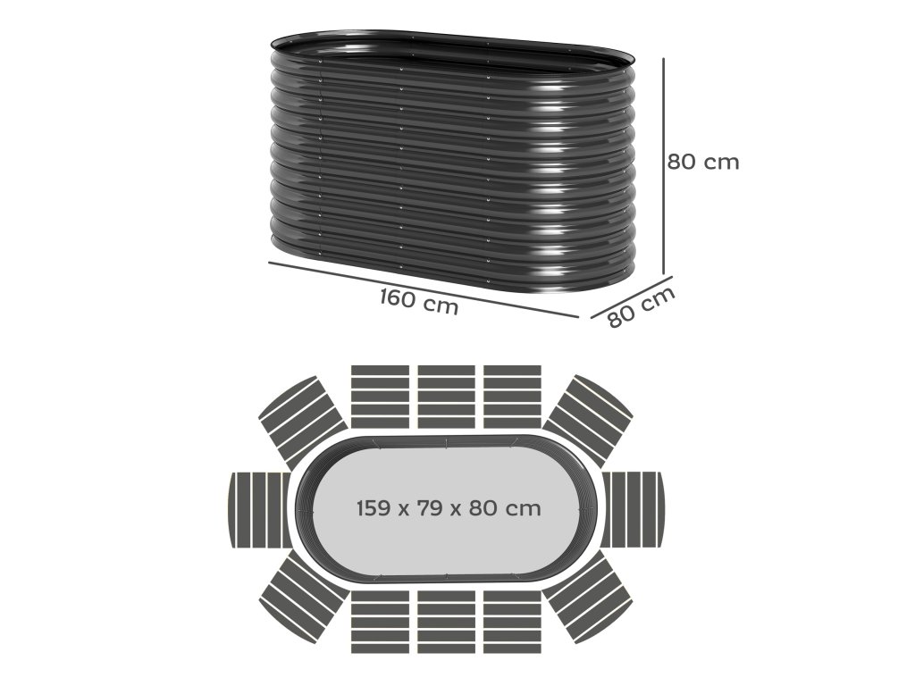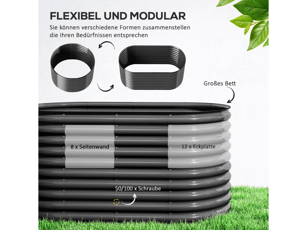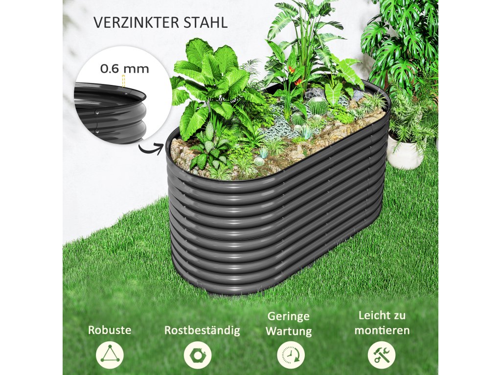 Modulární vyvýšený zahradní záhon od společnosti Outsunny se flexibilně přizpůsobí vašim požadavkům na design. Tento pozinkovaný vyvýšený záhon pro balkony s oválnou konstrukcí ve tvaru vlny je odolný proti korozi a vydrží vysoký tlak i nepřízeň počasí. Je ideální pro rostliny s hlubokými kořeny a nabízí dostatek prostoru a hloubky. Otevřená základna květináče podporuje vynikající odvodnění a podporuje zdravé kořeny, zatímco gumové okraje a rukavice zajišťují bezpečnější montáž.