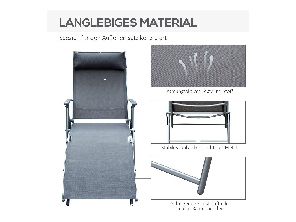 - Všestranné použití: Lehátko je odolné vůči povětrnostním vlivům, a proto je ideální pro venkovní použití, například na zahradě, na balkoně nebo při kempování.