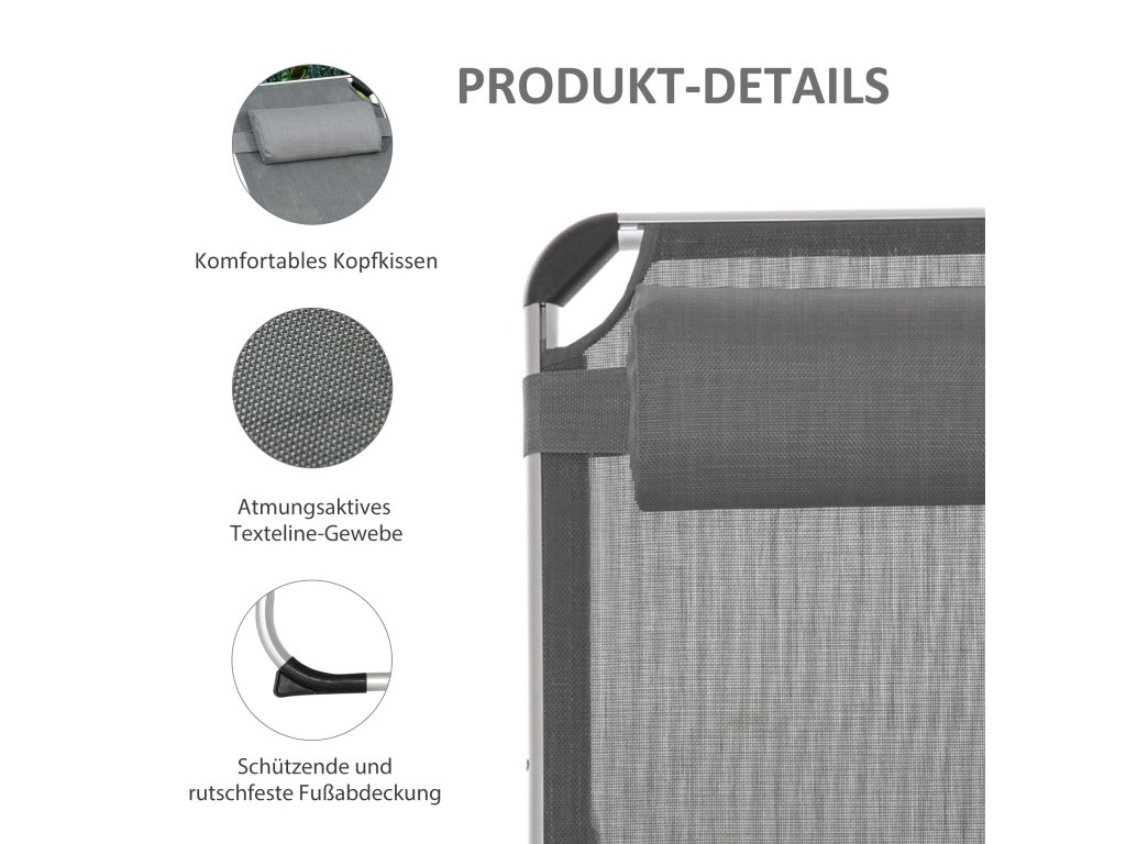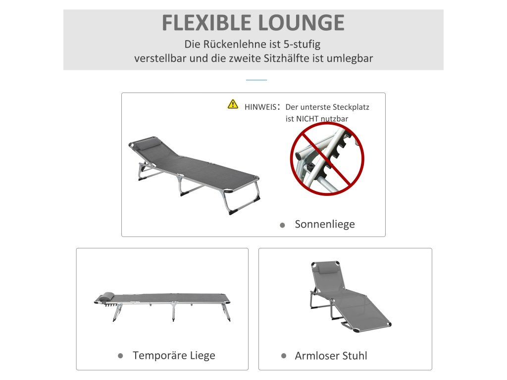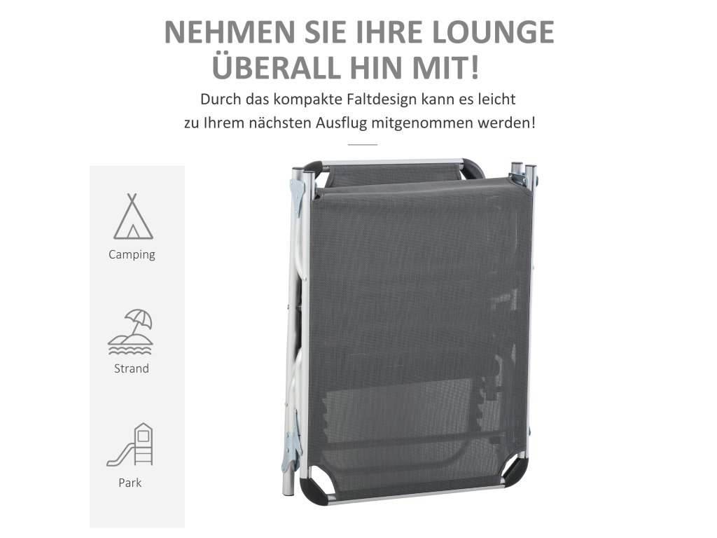 Toto skládací zahradní lehátko od společnosti Outsunny je ideálním doplňkem vaší zahrady, pokud si chcete jednoduše užívat letního slunce. Díky čtyřsměrně nastavitelnému opěradlu si můžete lehátko libovolně přizpůsobit svým osobním potřebám a robustní hliníkový rám s prodyšným potahem vám nabízí pohodlné lenošení. Je ideální pro venkovní použití. Skvěle se hodí jako zahradní lehátko.
