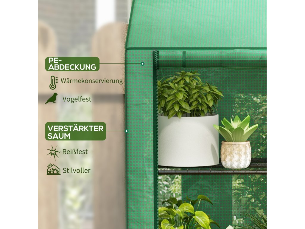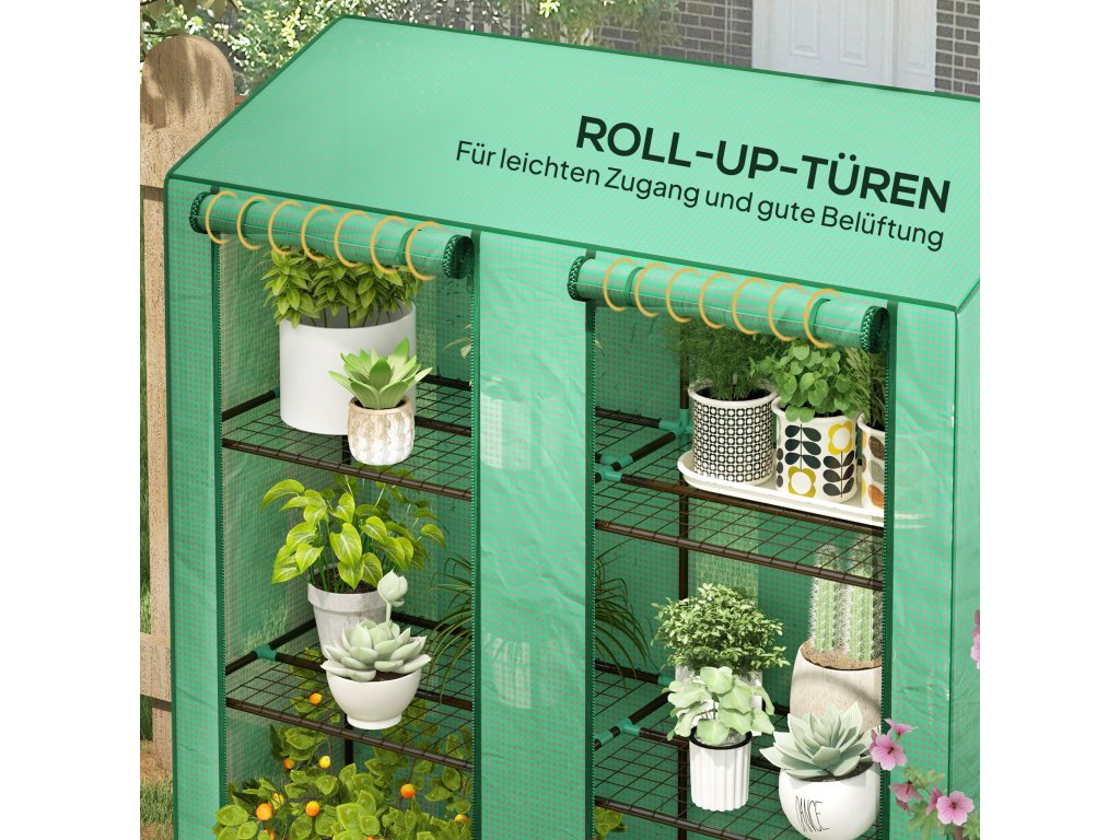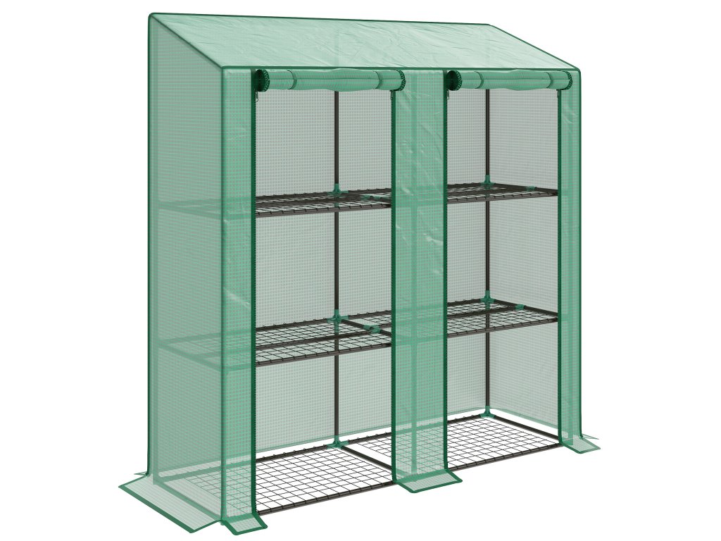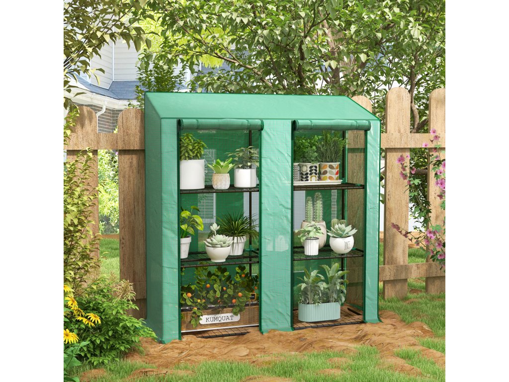 Outsunny mini skleník, 3 úrovně, 6 drátěných polic, 2 otvory, plastová plachta, zelená barva