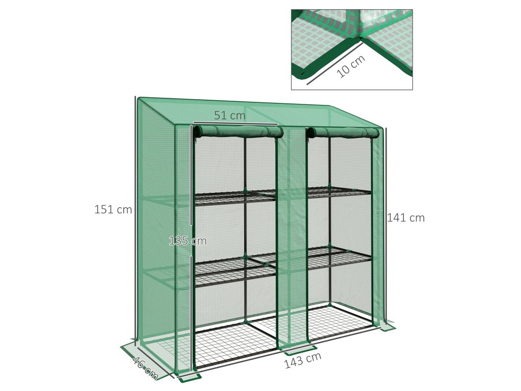 - Vnitřní rozměry skleníku: 143L x 46W x 141/151H cm. Dveře: 51Š x 135V cm. Max. Nosnost na jednu polici: 15 kg. Malý balkonový skleník lze snadno sestavit pomocí dodaných plastových spojovacích prvků.