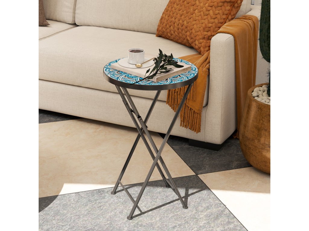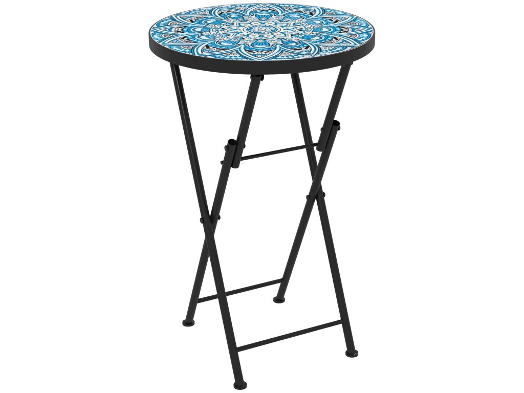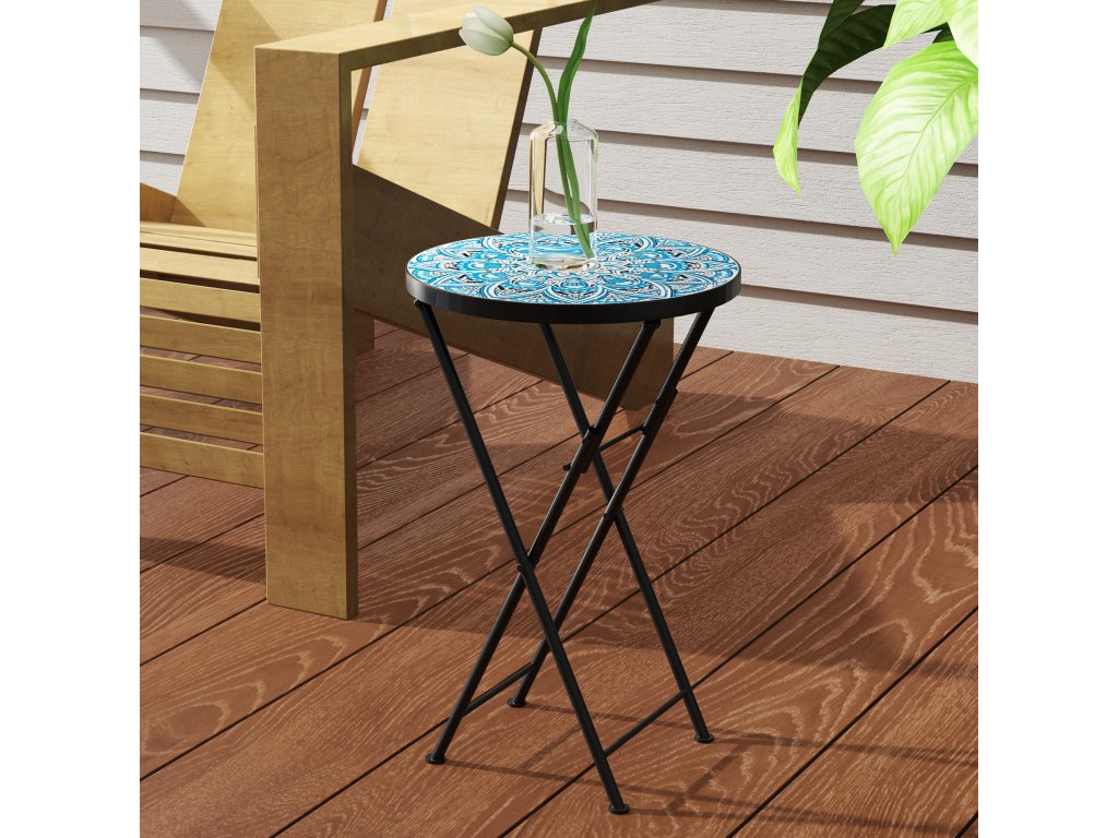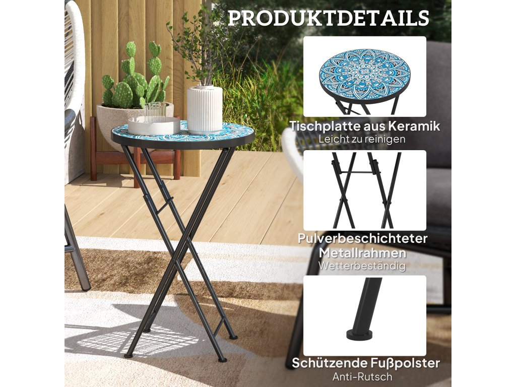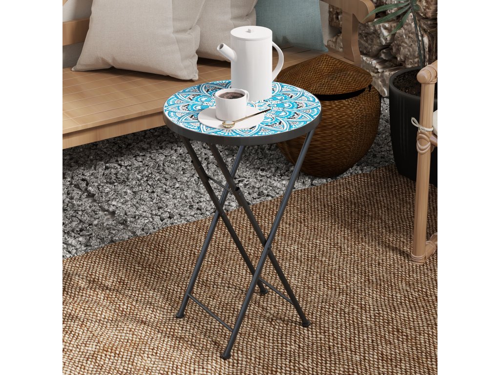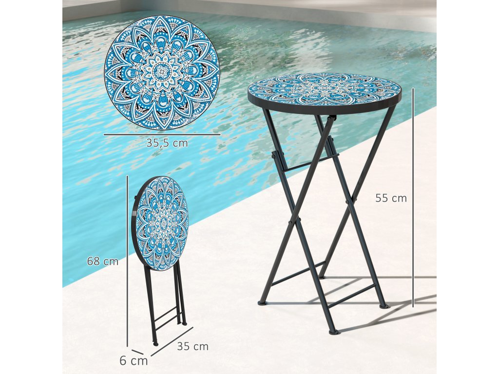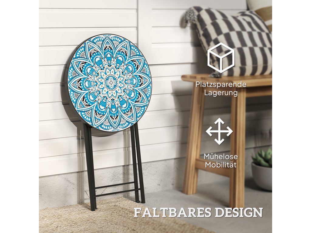 Outsunny mozaikový zahradní stůl, skládací kulatý stůl na terasu s kovovým rámem a keramickou deskou, mozaikový vzor, modrý