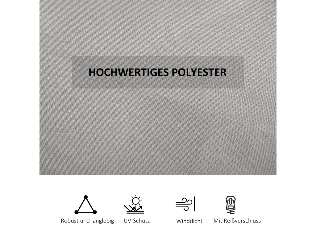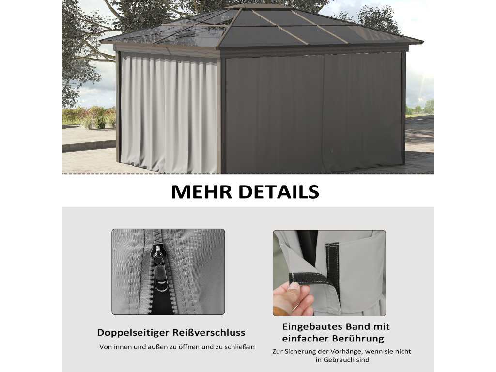 - Silný a odolný materiál: Vysoce kvalitní polyesterová tkanina je pevná a odolná a bezpečně vás ochrání před větrem a povětrnostními vlivy, když jste v altánu. Díky zipu se snadno otevírá a zavírá.