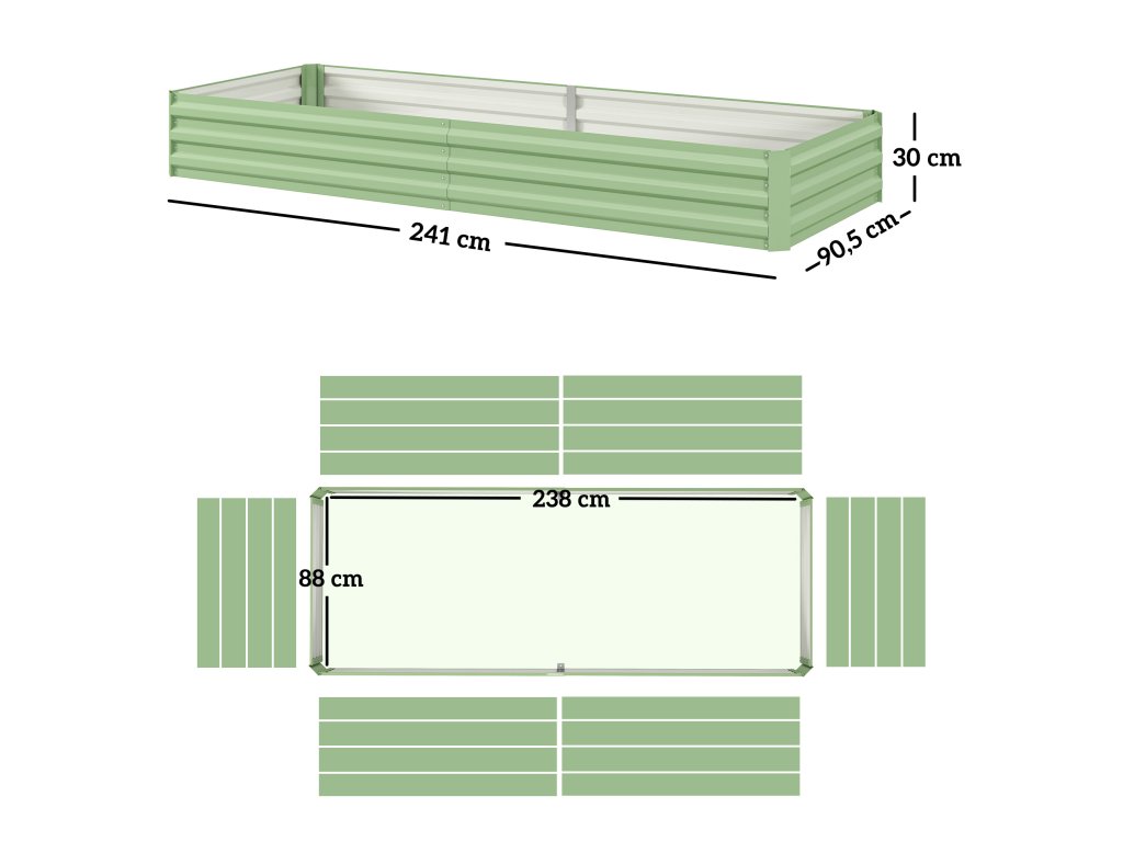 - Informace o výrobku na bylinkovém záhonu: Celkové rozměry: 241L x 90,5W x 30H cm, plocha pro výsadbu: 238L x 88W x 30H cm