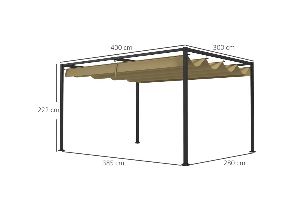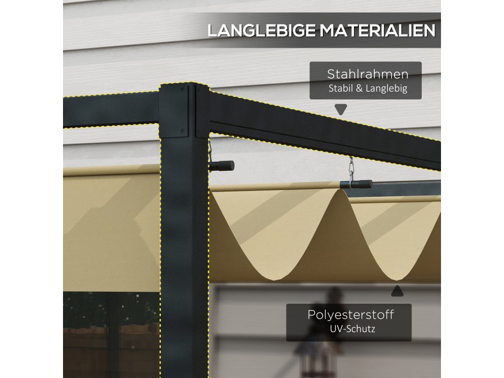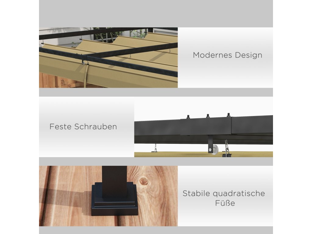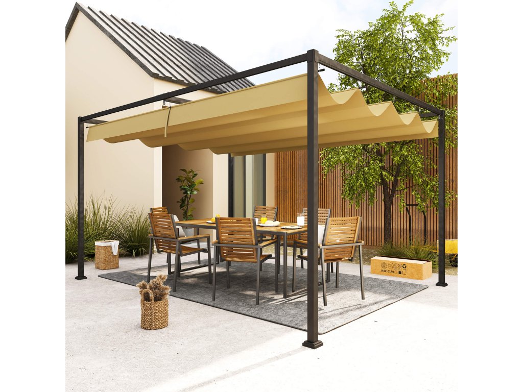 - Robustní konstrukce: Kovový rám pergoly s práškovým nástřikem a odolností proti korozi je speciálně navržen pro dlouhodobé venkovní použití