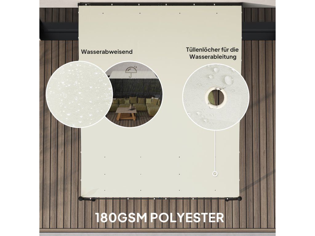 - Střecha odolná proti povětrnostním vlivům: Tento kryt terasy je vyroben z robustního polyesteru o gramáži 180 g/m², nabízí účinnou ochranu proti mírnému dešti a je vybaven 16 odtokovými otvory, které zabraňují hromadění vody a tím i dalšímu zatížení