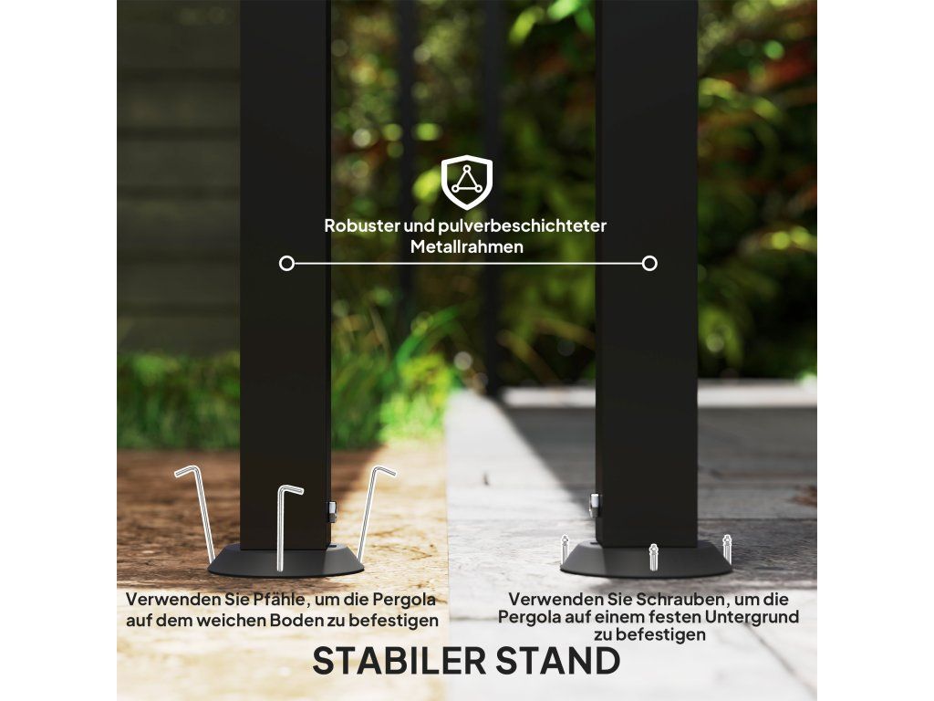 - Robustní konstrukce: Práškově lakovaná kovová konstrukce této pergoly zajišťuje zvýšenou stabilitu a odolnost. Zemní kotvy a rozpěrné šrouby, které jsou součástí dodávky, zaručují pevnou a nekomplikovanou instalaci