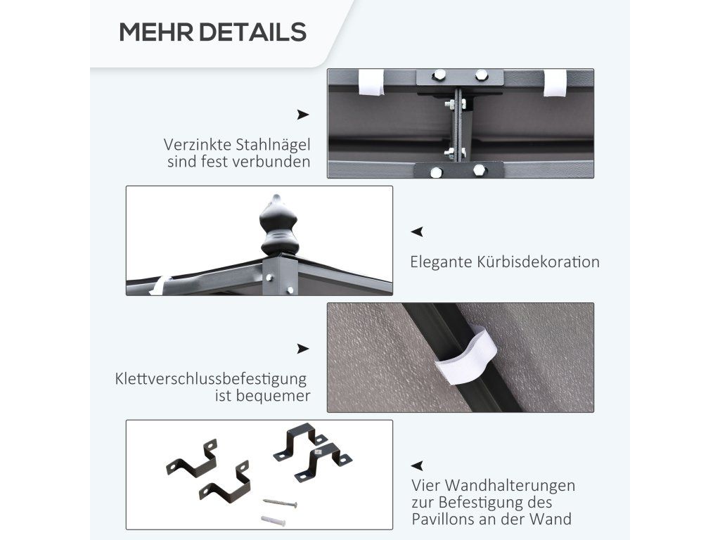Naši pergolu od společnosti Outsunny doporučujeme nejen díky její vysoké kvalitě, ale také díky jejímu jedinečnému designu. Díky modernímu designu a otevřené konstrukci ji lze použít jako zahradní pavilon, zastřešení terasy nebo přístřešek. Při plánování a výrobě pergoly se počítalo s 16 oky, která jsou umístěna na okraji střechy, aby mohla odtékat dešťová voda. V případě potřeby je možné střechu terasy Premium připevnit ke zdi pomocí šroubů. Díky tomu je vhodná zejména pro vstupní nebo okenní prostory, kde poskytuje dostatečnou ochranu před přímým slunečním zářením. Vezměte si naši elegantní pergolu se zakřivenou střechou a užívejte si chladivého stínu pod ní na své zahradě, terase nebo dvoře.