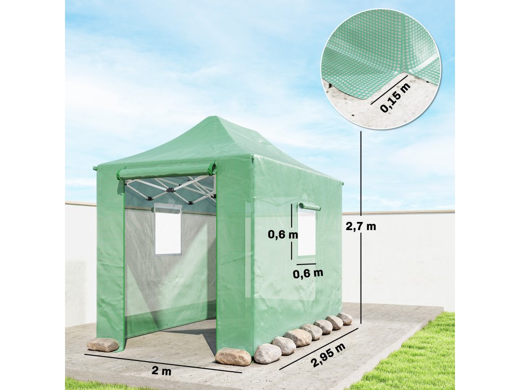 - Celkové rozměry fóliového skleníku: 295 Š x 200 H x 270 V cm. Nutná montáž.