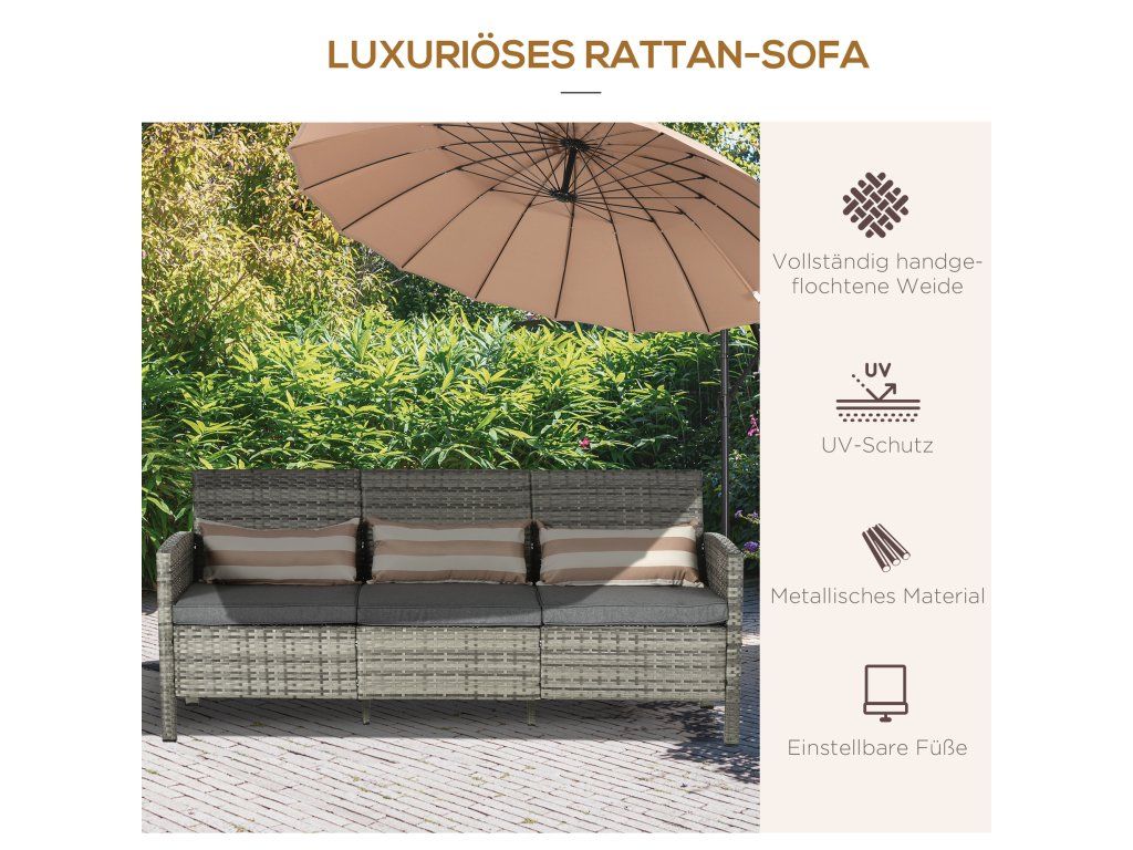 Outsunny ratanová pohovka s polštáři, třímístná, zahradní lounge pohovka, ocel, šedá, 173 x 68 x 78 cm