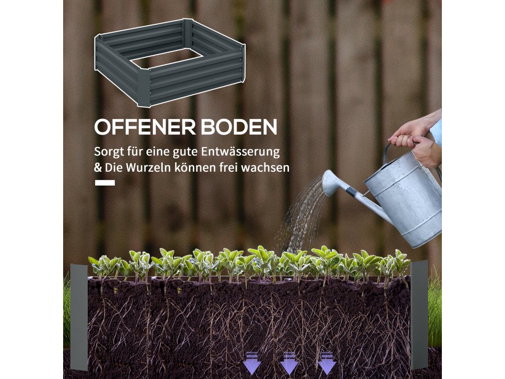 - Otevřená základna: Díky otevřenému dnu zajišťuje tento vyvýšený zahradní záhon účinný odtok vody, zabraňuje jejímu stagnování a umožňuje vašim rostlinám zdravý růst kořenů