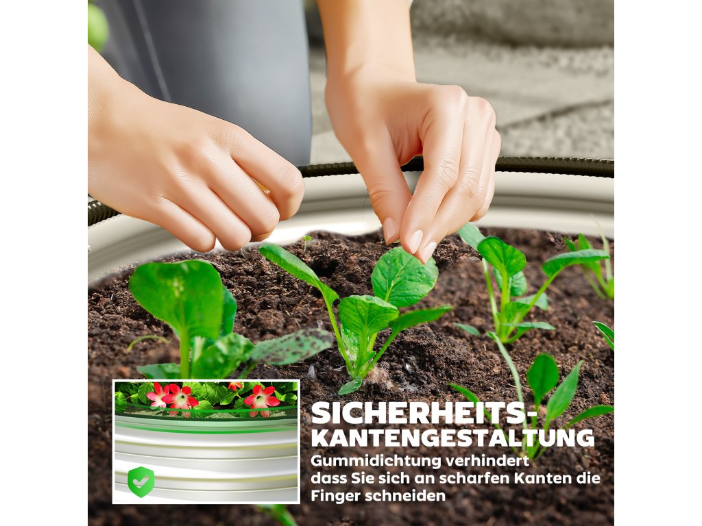 - Chráněné okraje: Horní okraj zahradního záhonu je chráněn gumovým okrajem, který zabraňuje poranění prstů ostrými hranami