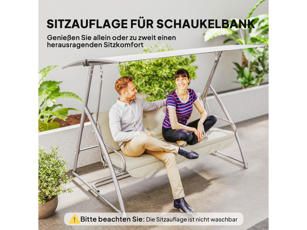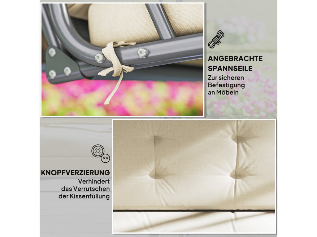 Tento sedací polštář od společnosti Outsunny je skvělým doplňkem pro vaši houpací lavici. Poskytuje dodatečné pohodlí. Vnější materiál je voděodolný a prodyšný. Polštář na židli se velmi snadno čistí a udržuje. Měkká výplň poskytuje dostatek dodatečného pohodlí. Polštář je navržen tak, abyste jej mohli bezpečně připevnit k venkovnímu nábytku a zabránit tak jeho sklouznutí. Všívání dodává polštáři křesla jedinečný vzhled a vylepší každou zahradní houpačku.