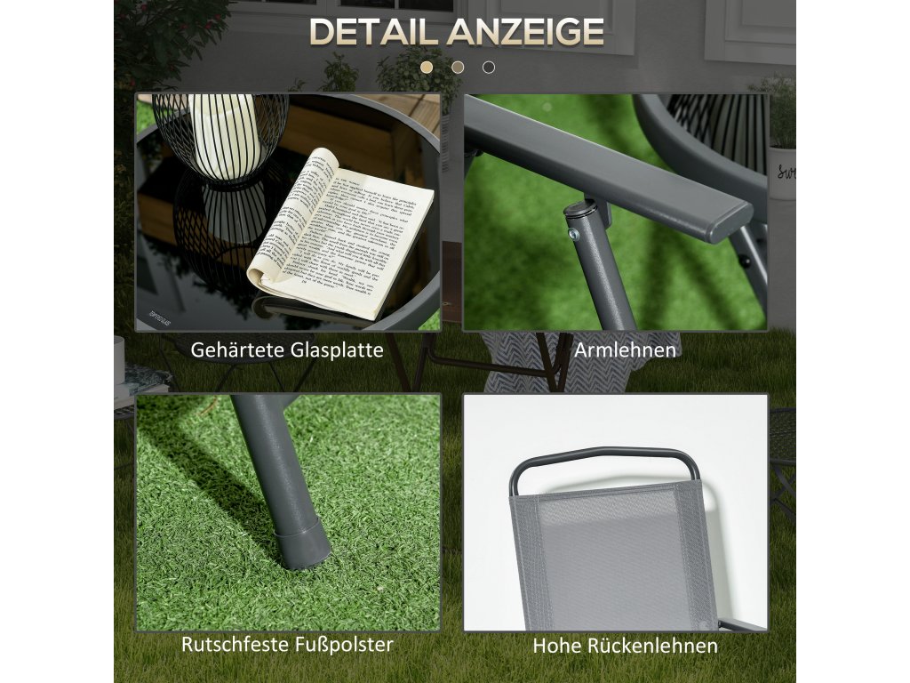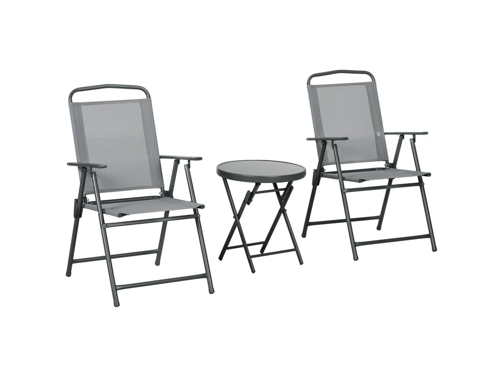 Třídílná sada zahradního nábytku od společnosti Outsunny se skládá z konferenčního stolku s deskou z tvrzeného skla a dvou skládacích židlí s područkami. Stůl a židle bistro setu jsou vyrobeny z kovového rámu s práškově lakovaným povrchem, takže jsou stabilní a robustní. Díky skládacímu provedení sady balkonového nábytku se stůl a židle snadno skladují a přepravují. Ideální způsob, jak si s Outsunny užít den přímo před vlastními dveřmi.