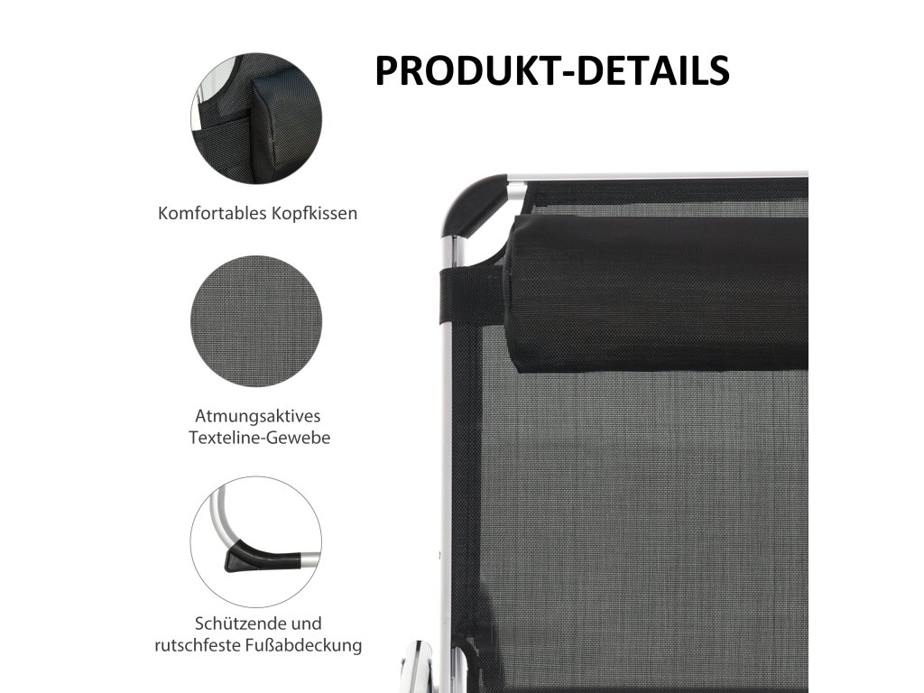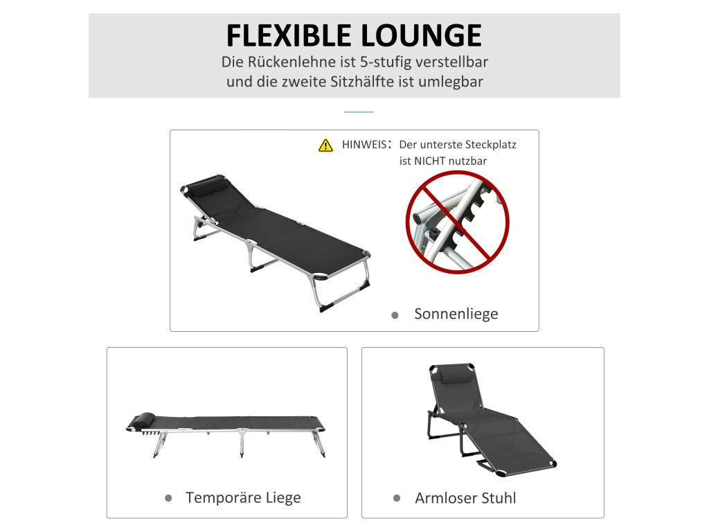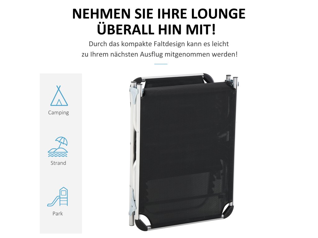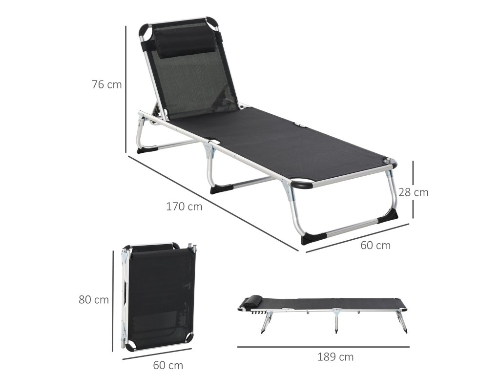 Toto skládací balkonové lehátko od společnosti Outsunny je ideálním doplňkem vaší zahrady, pokud si chcete jednoduše užívat letního slunce. Díky opěradlu nastavitelnému ve 4 směrech si můžete lehátko libovolně přizpůsobit svým osobním potřebám a robustní hliníkový rám s prodyšným potahem vám nabízí pohodlné lenošení. Je ideální pro venkovní použití. Skvěle se hodí jako zahradní lehátko.
