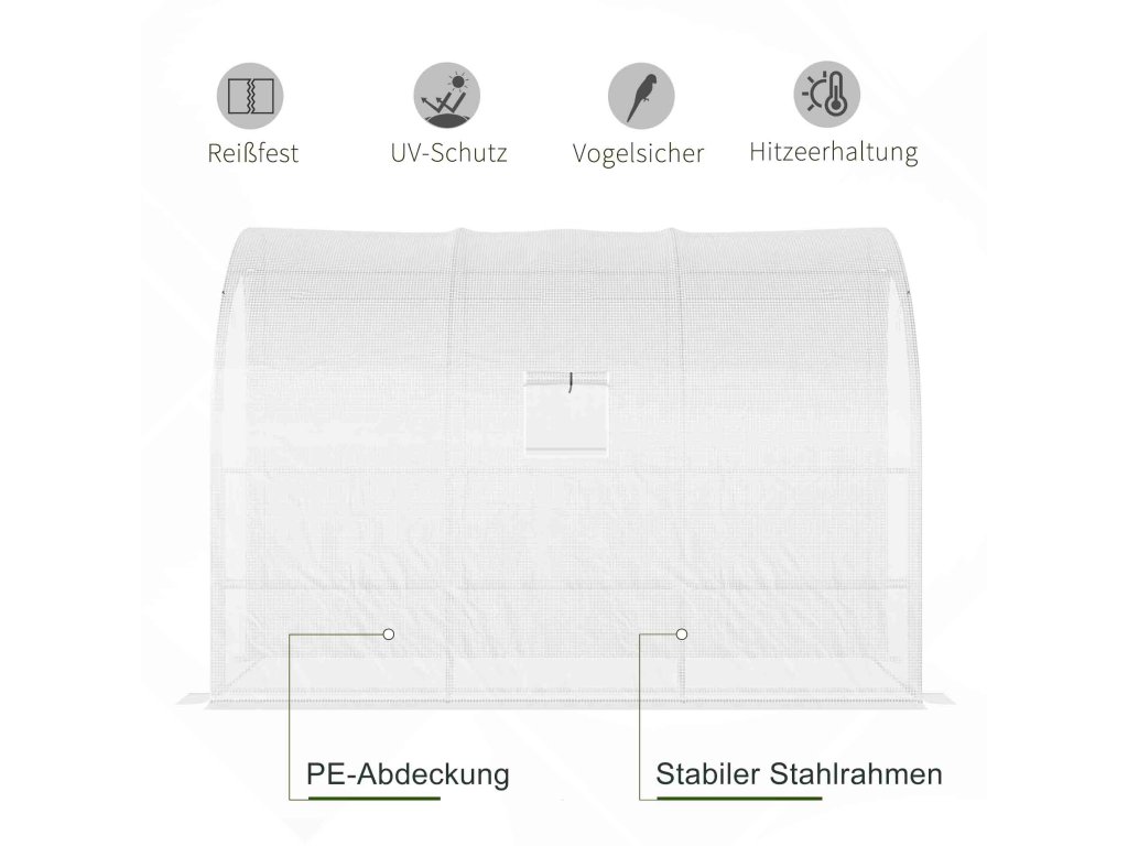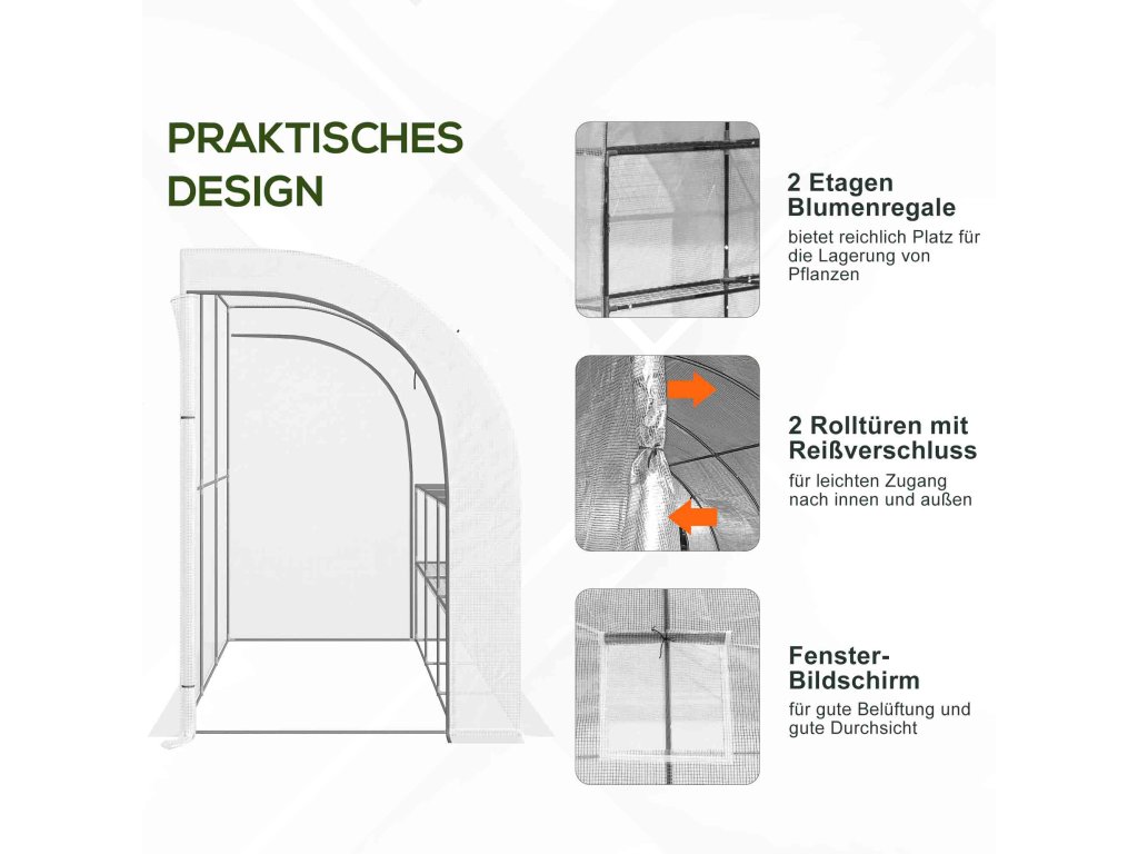 - Dveře na zip a rolovací okno: K rostlinám a nářadí se snadno dostanete přes dveře na zip na obou stranách fóliového skleníku. Integrované síťové okno účinně reguluje přísun tepla a světla