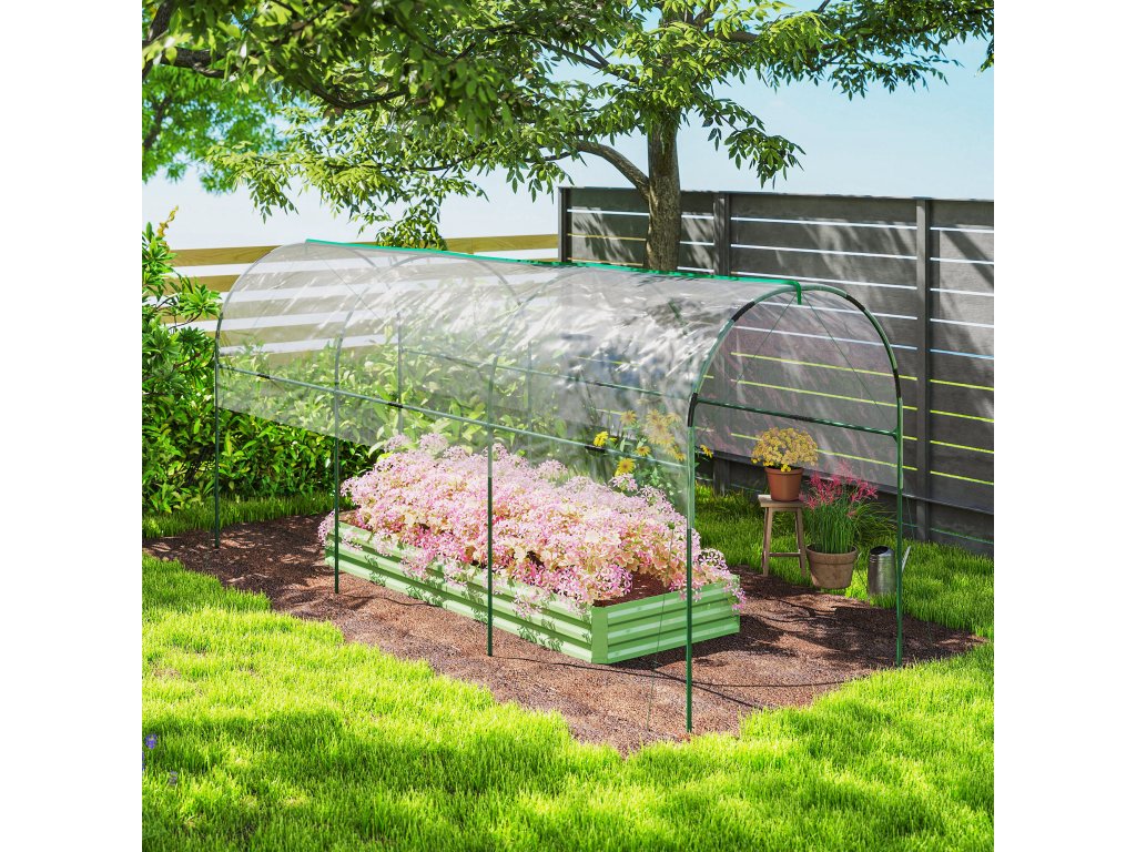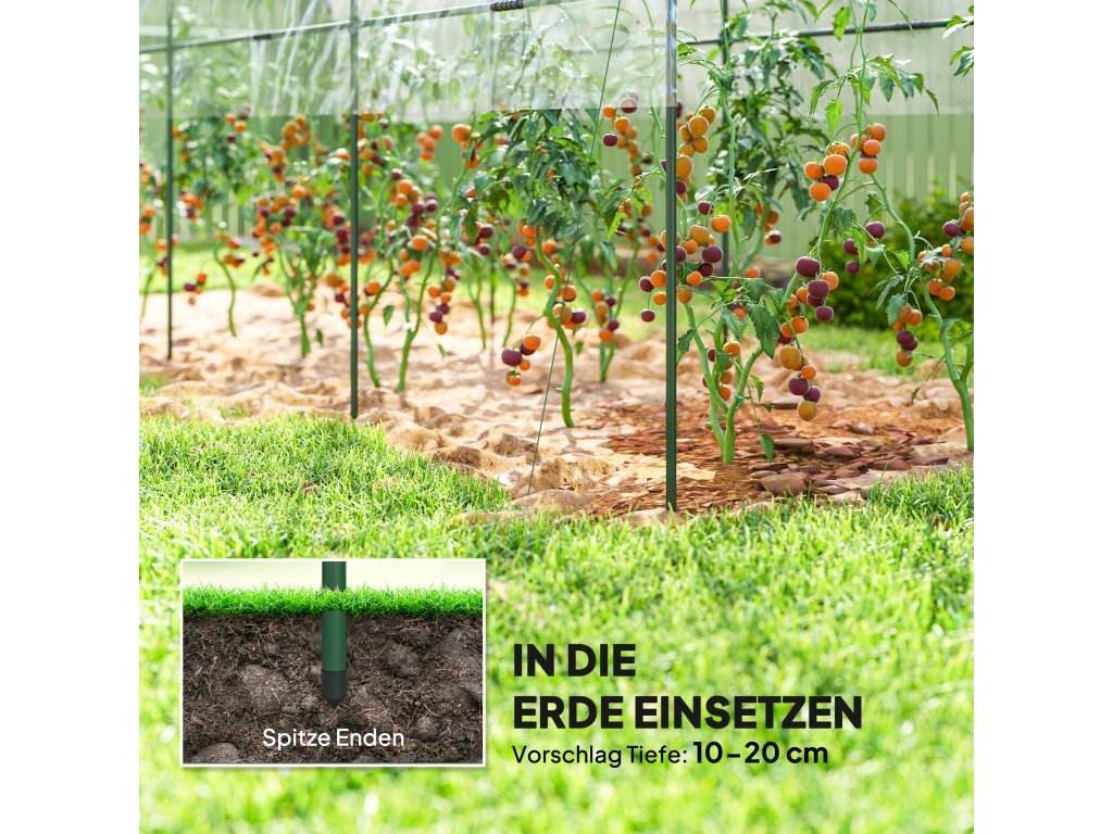 - Robustní konstrukce: Skládá se ze čtyř robustních a nerezavějících ocelových oblouků. Zakřivená horní část skleníku na rajčata umožňuje rychlý odtok dešťové vody a zabraňuje prověšení plachty. Kromě toho je dodáváno 8 zemních hrotů, které rám bezpečně upevní k zemi.