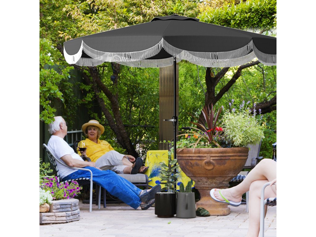 - Ochrana před sluncem: Venkovní slunečník o šířce 2,69 m vytváří stinné plochy díky upevnění na zahradní stůl nebo těžký podstavec. Elegantní design se střapci pro exkluzivní vzhled.