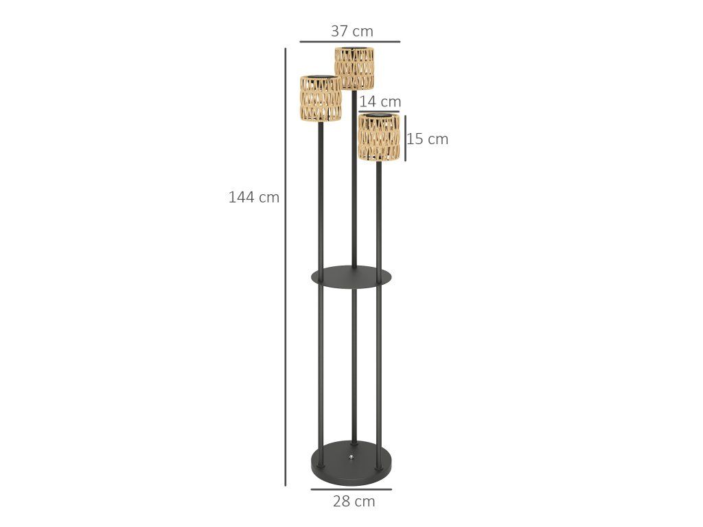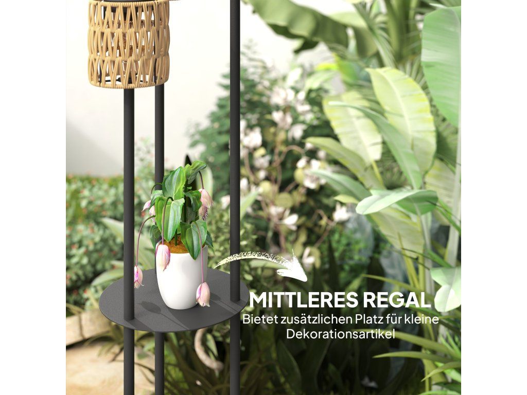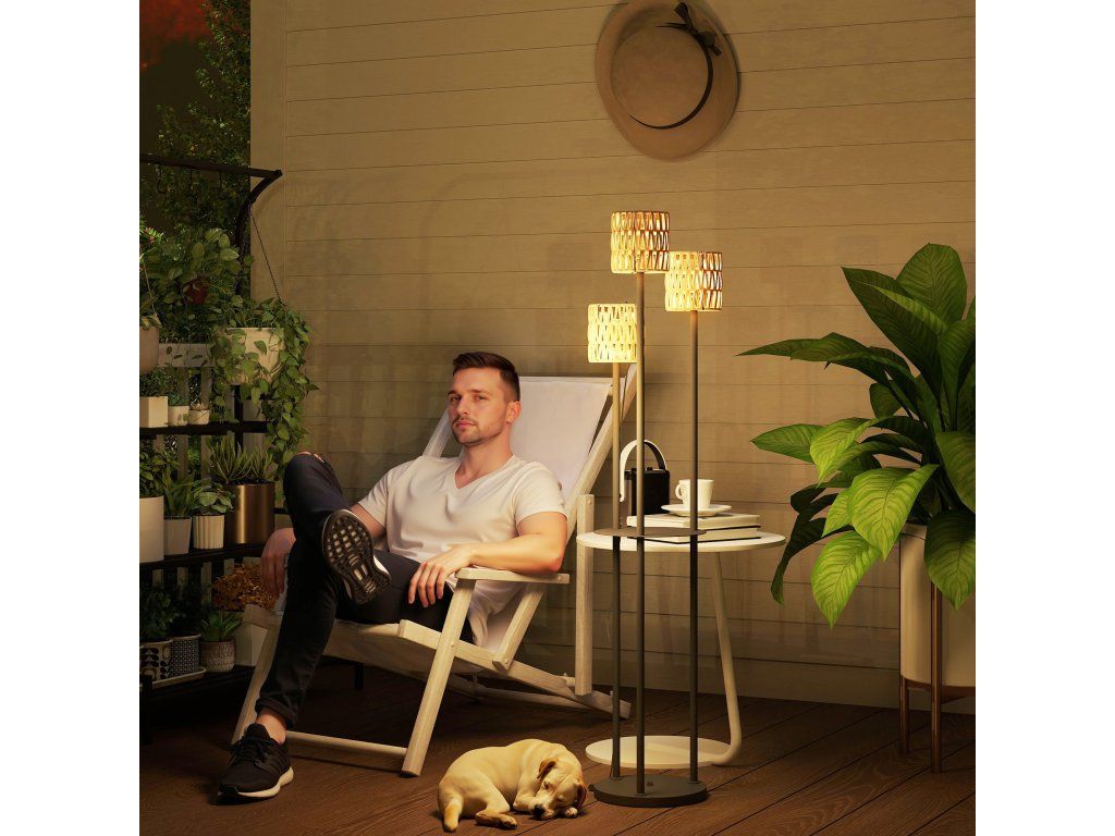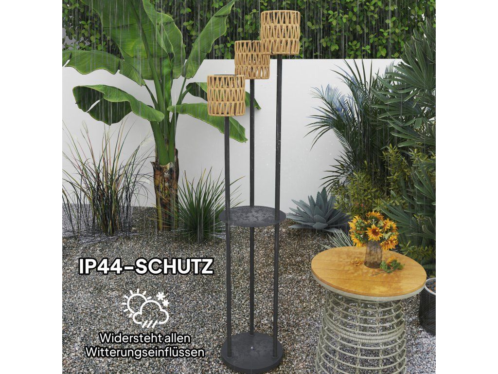 - Stabilní stojan: Tři sloupy jsou pevně spojeny s kulatým ocelovým podstavcem, díky čemuž je tato venkovní lampa obzvláště stabilní. Její funkčnost zvyšuje PE ratan odolný vůči UV záření a stupeň krytí IP44.