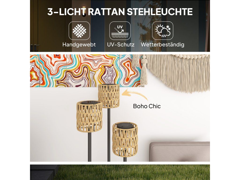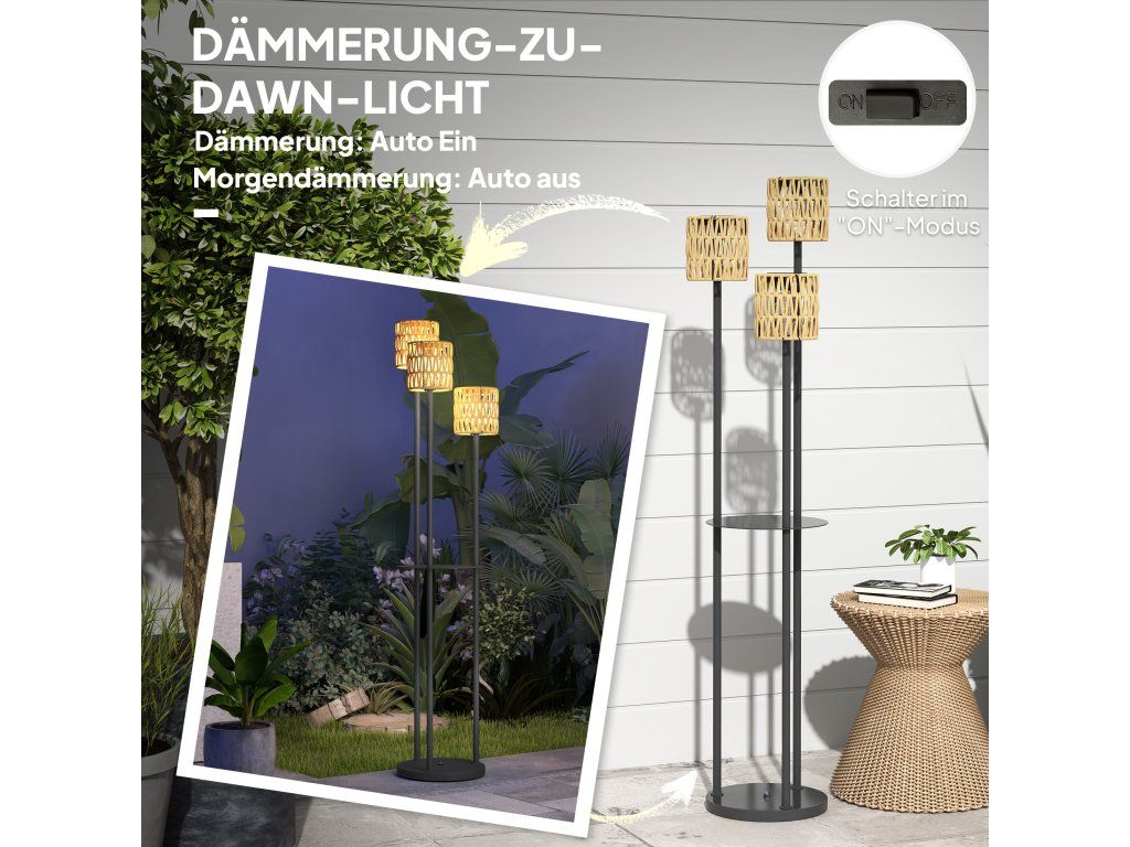 Outsunny solární stojací lampa ratan solární lampy se světelným senzorem 3 světla solární světlo v boho stylu IP44 Ø37 x 144H cm