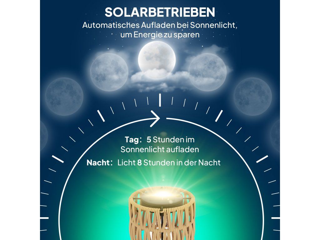 - Solární zahradní lampa: Díky vysoce účinnému solárnímu panelu se solární lampa plně nabije během 5 hodin slunečního svitu a za soumraku poskytuje až 8 hodin automatického svícení bez nutnosti zapojení.