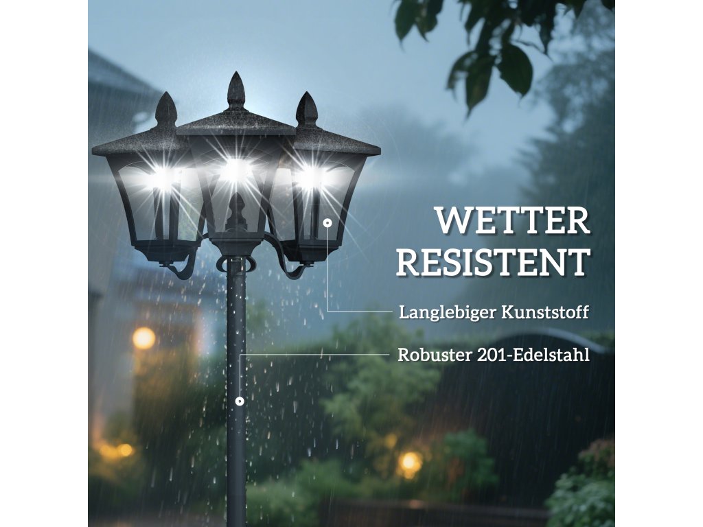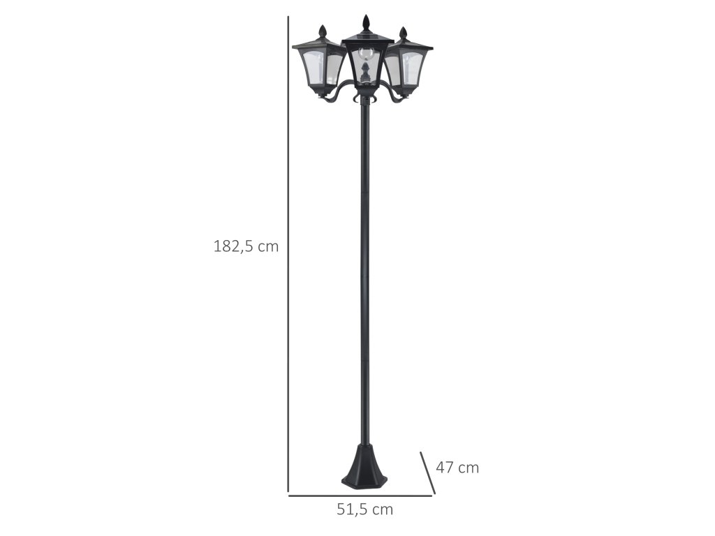 Venkovní sloupková lampa se 3 solárními světly od společnosti Outsunny má odnímatelné a stmívatelné světlo LED a automatický světelný senzor pro pohodlné noční osvětlení. Energeticky úsporná zahradní lampa vydrží svítit až 6 hodin na plné solární nabití. Díky voděodolným materiálům a elegantnímu stylu je solární lampa ideálním doplňkem do vašich zahrad, na cesty, terasy, paluby, k bazénu apod.