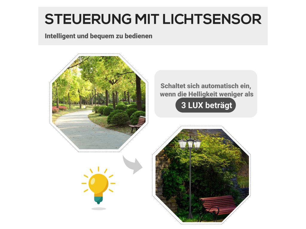 - ✔ Automatický světelný senzor se aktivuje za soumraku, když je UV zářivost nižší než 3LUX