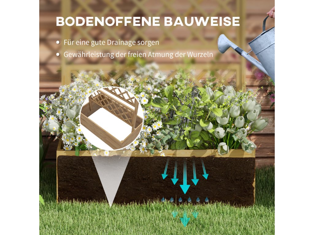 - konstrukce 2 v 1: Kombinuje vyvýšený záhon s mříží. Kombinovaná jednotka s truhlíkem pro květiny a rostliny a mřížovou zadní částí pro popínavé rostliny
