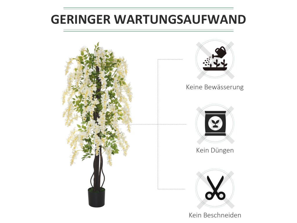 Naše umělé keře vistárie od společnosti Outsunny si udrží svůj tvar po mnoho let bez nutnosti prořezávání a péče. Nemusíte ji zalévat, hnojit ani se o ni starat na cestách. Umělé rostliny jsou dodávány již hotové a s květináčem. Hodí se k jakémukoli typu dekorace. Umělá rostlina je ideální pro vnitřní i venkovní použití.