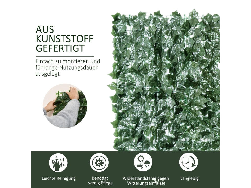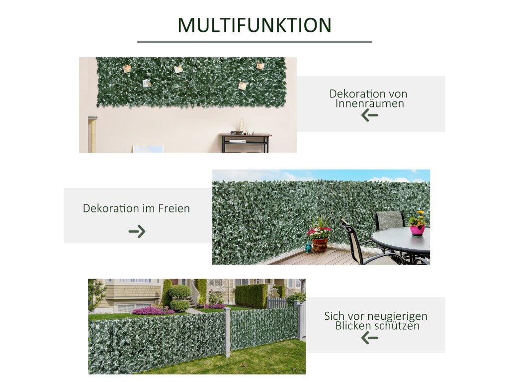 Tmavě zelená zástěna na ochranu soukromí od společnosti Outsunny je působivá ve všech směrech. Snadno se instaluje, nekomplikovaně se udržuje a flexibilně se připevňuje. Husté listy jsou vytvořeny po vzoru sladkých brambor. Hluboce zalomená konstrukce je vyrobena z plastu odolného proti UV záření a povětrnostním vlivům a poskytuje spolehlivou ochranu před zvědavými pohledy. Existuje celá řada možností instalace, ať už na vlastní balkon, terasu, nebo jako doplněk k zahradnímu plotu. Přizpůsobte si svůj venkovní prostor nekomplikovaným způsobem.