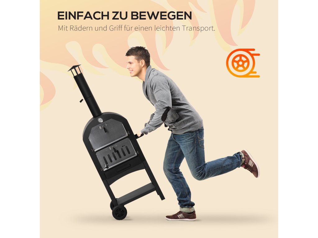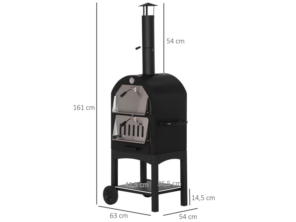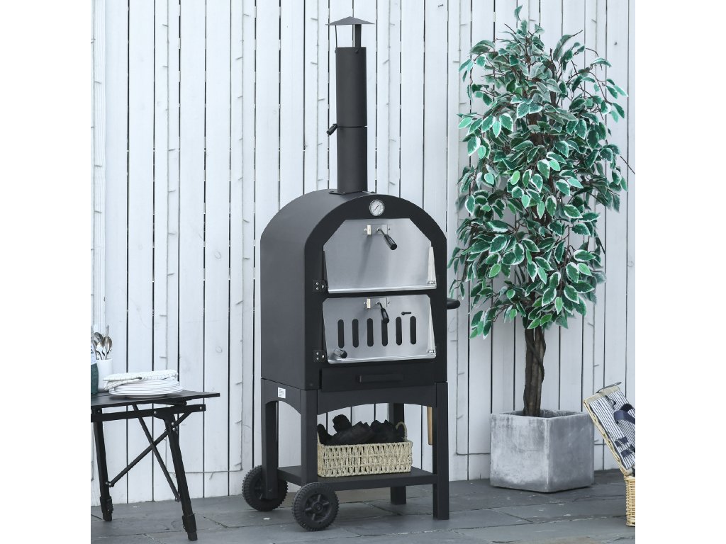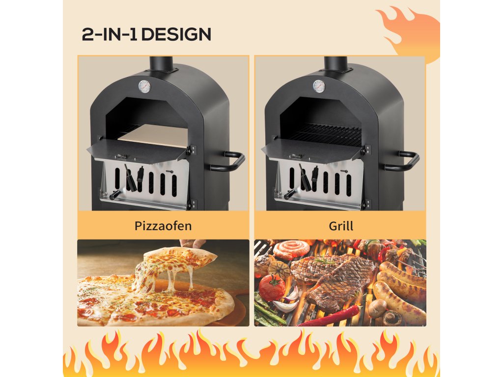 S touto pecí 2 v 1 od společnosti Outsunny si můžete připravit vynikající pizzu v restaurační kvalitě přímo na své zahradě! Díky přiloženému kameni na pizzu a grilovacímu roštu lze troubu používat jako pec na pizzu nebo gril. Teploměr na horní straně trvale zobrazuje teplotu uvnitř pece, aby se jídlo nepřipálilo. Pro bezpečnost všech přítomných jsou teplo a kouř odváděny nahoru vysokým kouřovodem.