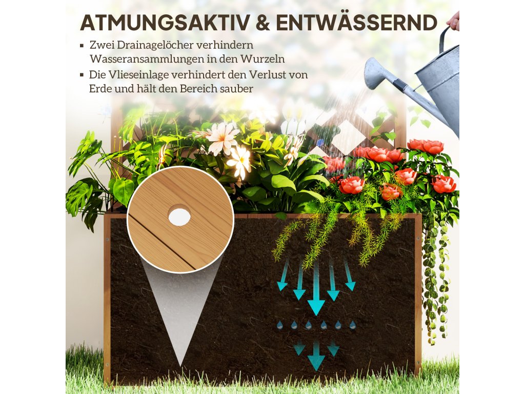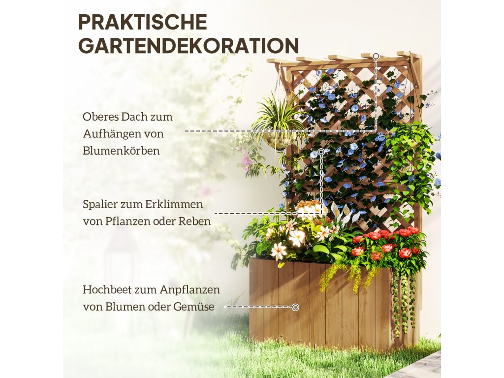 S vyvýšeným zahradním záhonem Outsunny můžete zahradničit dvěma způsoby. Tato speciální kombinace prostorného vyvýšeného záhonu pro květiny a bylinky a mříže pro popínavé rostliny nabízí více prostoru a okouzlující závěsnou stříšku. Důmyslné odvodňovací otvory a textilní vložka v balkónovém vyvýšeném záhonu podporují zdraví vašich rostlin. Robustní dřevěná konstrukce je odolná vůči povětrnostním vlivům a vylepší každou zahradu.
