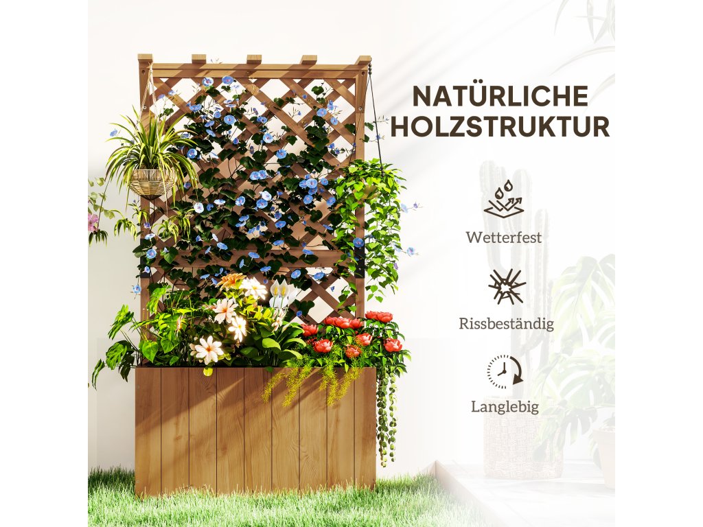 - Dvoufunkční design: šikovně kombinuje vyvýšený záhon a mříž v jednom prvku. Ideální pro květiny a rostliny, mříž poskytuje také dokonalou oporu pro popínavé rostliny a vinnou révu.