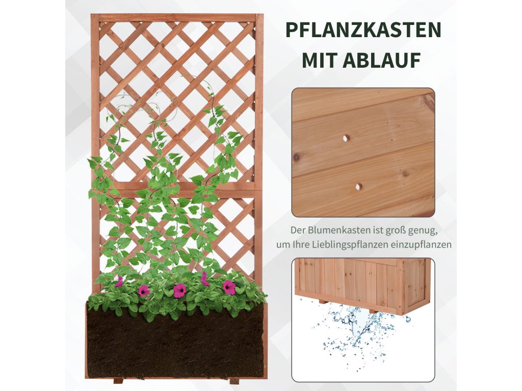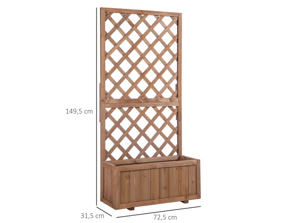 Představte své oblíbené rostliny stylově a dodejte svému venkovnímu prostoru charakter s tímto rustikálním květináčem od Outsunny! Robustní treláž poskytuje ideální příležitost k pěstování dekorativních popínavých rostlin a vytvoření okouzlujícího ústředního bodu ve vaší zahradě. Rám z masivního dřeva odolného vůči povětrnostním vlivům chrání květináč před všemi povětrnostními vlivy a umožňuje vám ho nechat venku trvale.