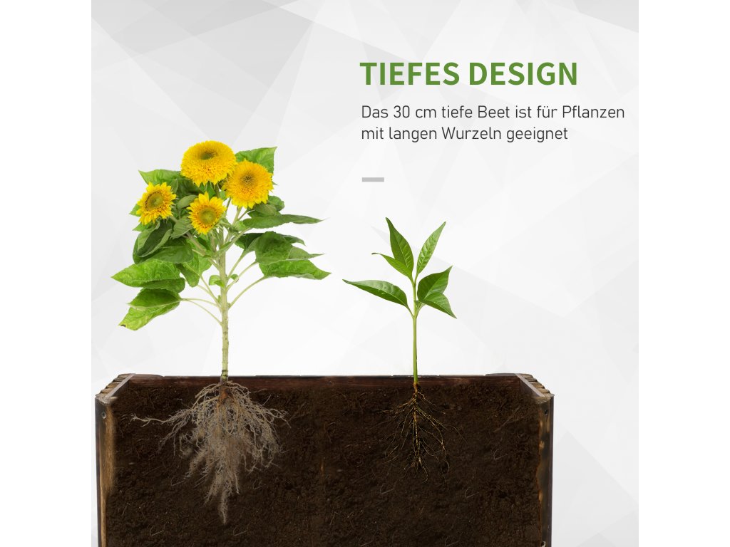 Tento vyvýšený záhon od společnosti Outsunny poskytuje dostatek prostoru pro pěstování bylinek, zeleniny a květin. Truhlík je vyroben z robustního přírodního jedlového dřeva a nabízí vysokou stabilitu a ochranu pro vaše oblíbené rostliny. Ať už na zahradu, balkon nebo terasu - tento vyvýšený záhon lze postavit na mnoha místech a osvěží vaši atmosféru harmonickou, živou zelení.