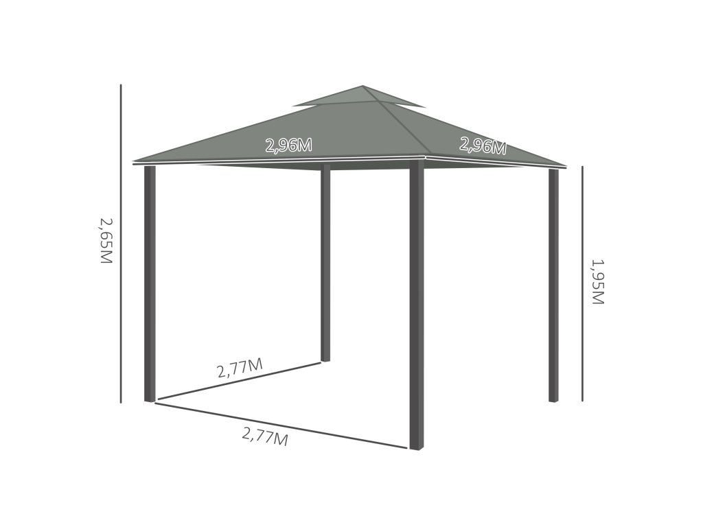 - PODROBNOSTI O VÝROBKU: Celkové rozměry: 2,96 D x 2,96 Š x 2,70 V m, výška okapu: 1,95 m. Nutná montáž. POZNÁMKA: Nedoporučuje se používat v extrémních povětrnostních podmínkách, jako je bouřka nebo silný vítr/dešť.