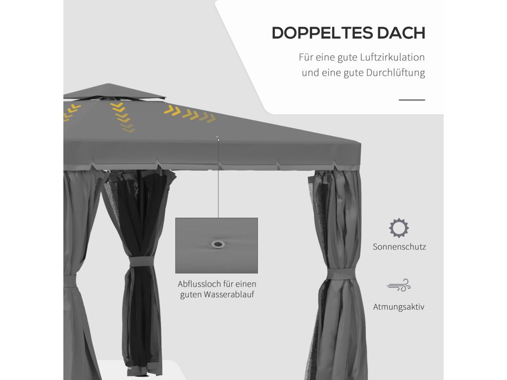 - STŘECHA SE DVĚMA ÚROVNĚMI: Dvouúrovňová střecha se síťovinou umožňuje dobrou cirkulaci vzduchu a chladivé osvěžení uvnitř altánu. Střešní kryt je vyroben z potaženého polyesteru, který poskytuje dobrou ochranu před sluncem a UV zářením. osm zapuštěných odtokových otvorů umožňuje nerušený odtok dešťové vody.