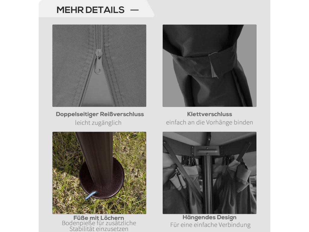 - ZÁCLONY A SÍTĚ: Odnímatelné sítě zabraňují přístupu otravného hmyzu a čtyři záclony slouží jako praktická zástěna pro vytvoření většího soukromí. Závěsy a sítě lze kdykoli snadno připevnit a odstranit.