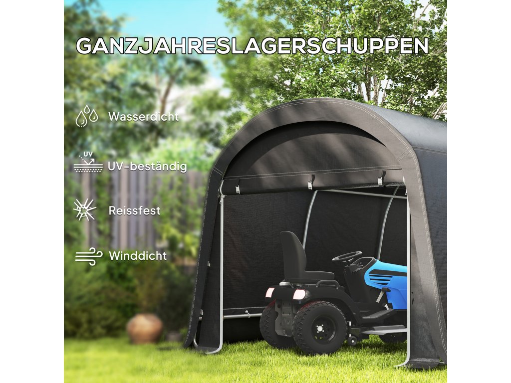- Ochrana proti povětrnostním vlivům: Tento robustní přístřešek na kola s plastovou plachtou chrání před vodou, UV zářením a větrem. Vaše kola, nářadí a venkovní vybavení jsou chráněny před deštěm, sněhem a silným slunečním zářením a zůstanou v suchu