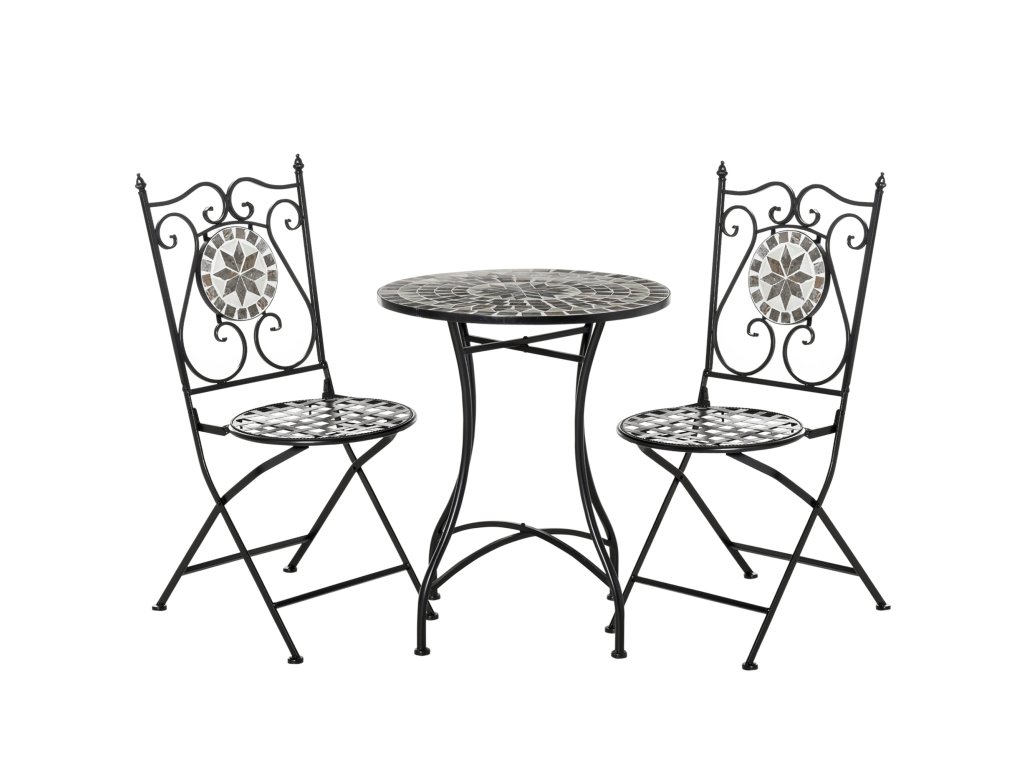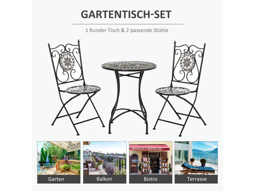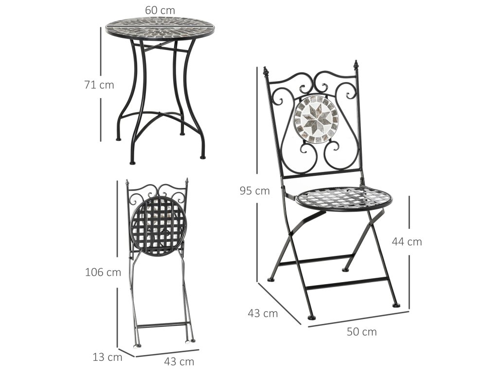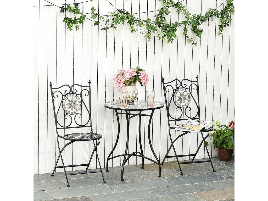 Outsunny zahradní sedací souprava pro 2 osoby balkonový nábytek mozaikový stůl + skládací židle kovová keramická dlaždice vícebarevná