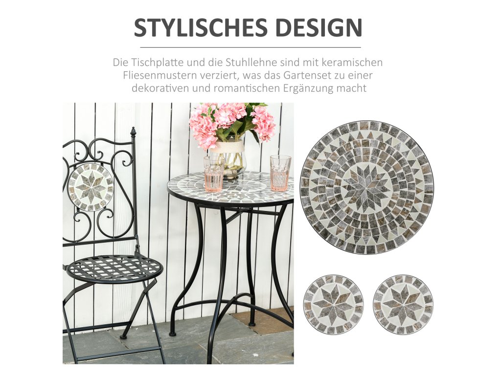 Vneste do svého každodenního života charakter a estetiku s touto třídílnou bistro soupravou od společnosti Outsunny. Sada zahradního nábytku se skládá z kulatého stolu s deskou z dekorativních keramických dlaždic s rytmickým mozaikovým vzorem a dvou židlí se stejným elegantním mozaikovým vzorem na opěradlech. Robustní kovová konstrukce zajišťuje, že stůl a židle jsou obzvláště stabilní, odolné vůči povětrnostním vlivům a mimořádně odolné.