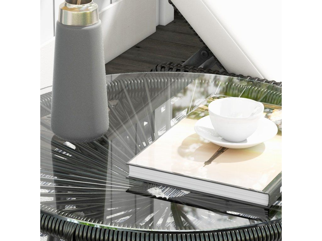 - Pevná konstrukce: Zahradní stolek se skládá z robustního kovového rámu s práškově lakovaným povrchem, tvrzeného skla a ratanového PE obalu. Materiál je pevný a odolný