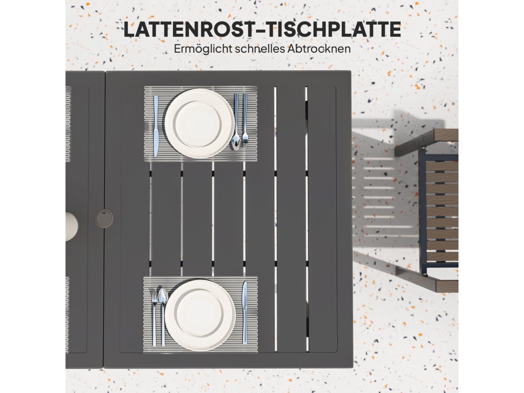 - Lamelový design: Stůl na terasu má atraktivní lamelový design, který zabraňuje hromadění vody a podporuje cirkulaci vzduchu - ideální do každého počasí.