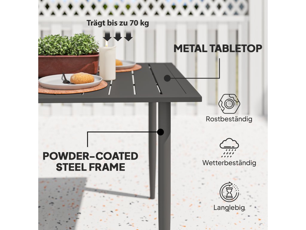 - ✔ Robustní kovový a práškově lakovaný ocelový rám zahradního stolu unese 70 kg