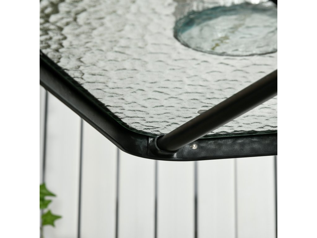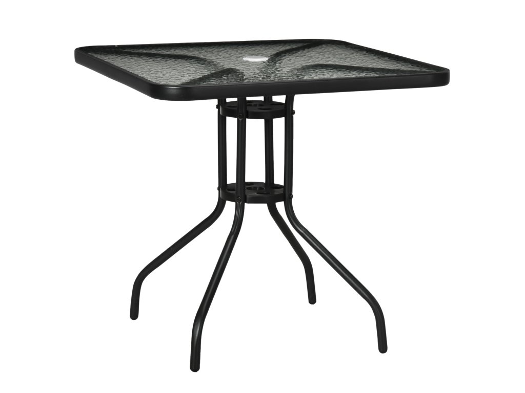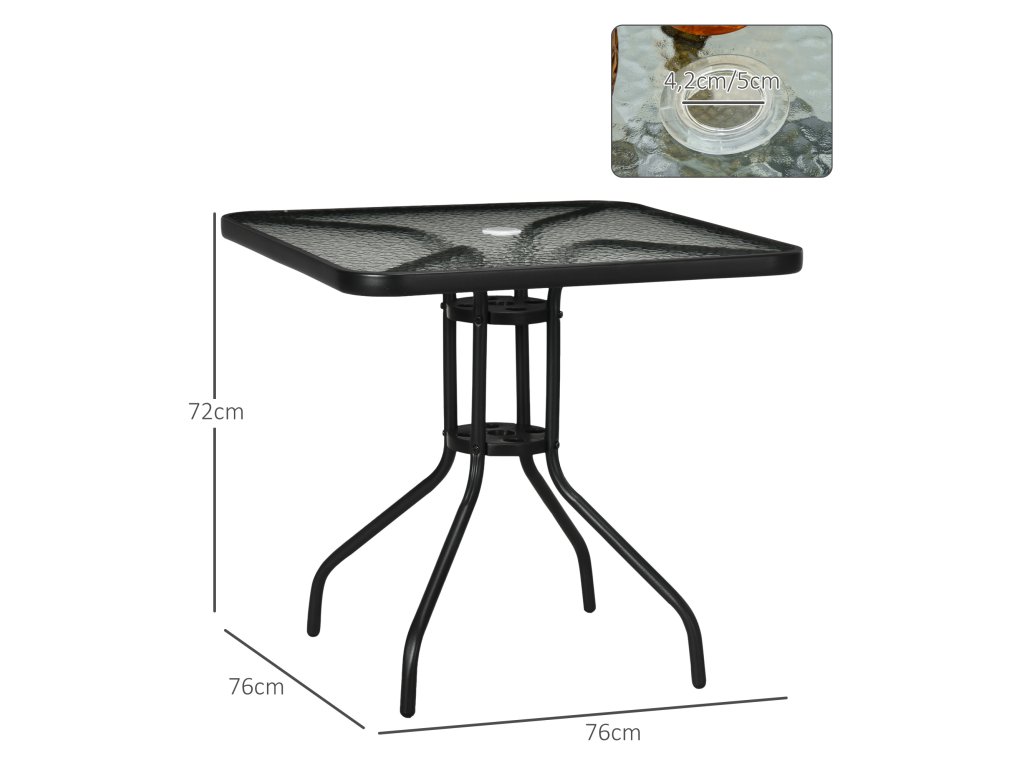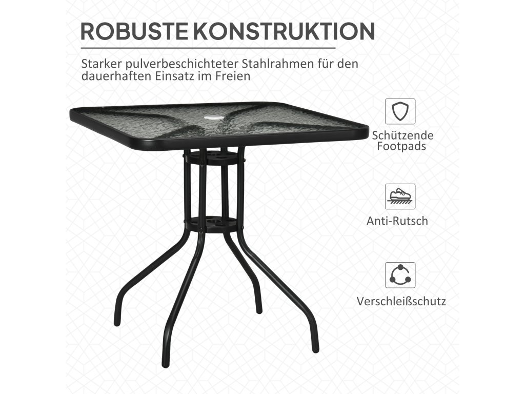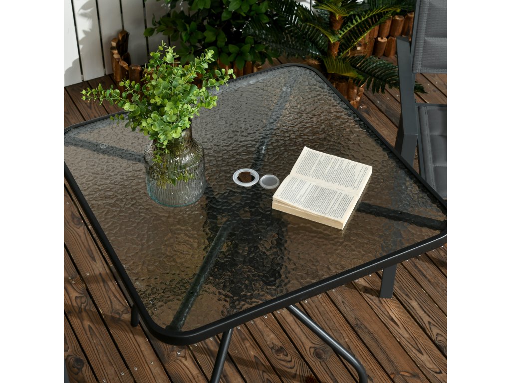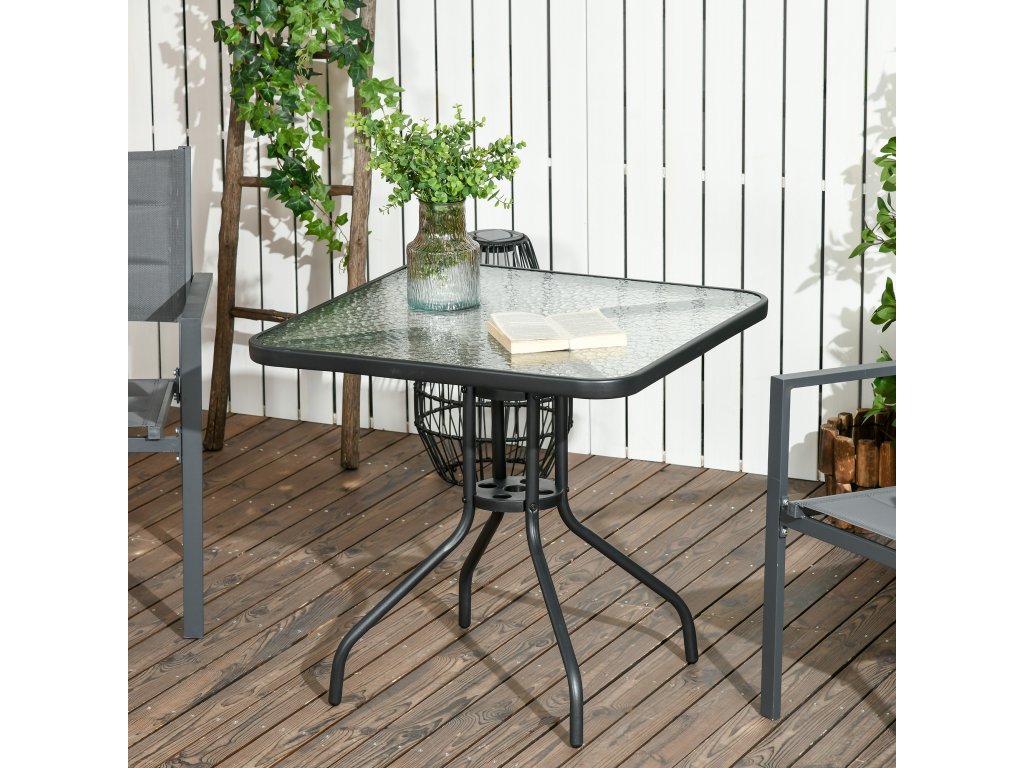 Vychutnejte si pobyt na čerstvém vzduchu s tímto elegantním čtvercovým zahradním stolem Outsunny odolným proti povětrnostním vlivům. Robustní ocelový rám a dlouhé nohy zahradního stolu zajišťují optimální stabilitu. Deska zahradního stolu s otvorem pro slunečník z tvrzeného skla poskytuje pevnou oporu a má otvor pro slunečník, který vás ochrání před sluncem. Ideální pro nadcházející roční období.