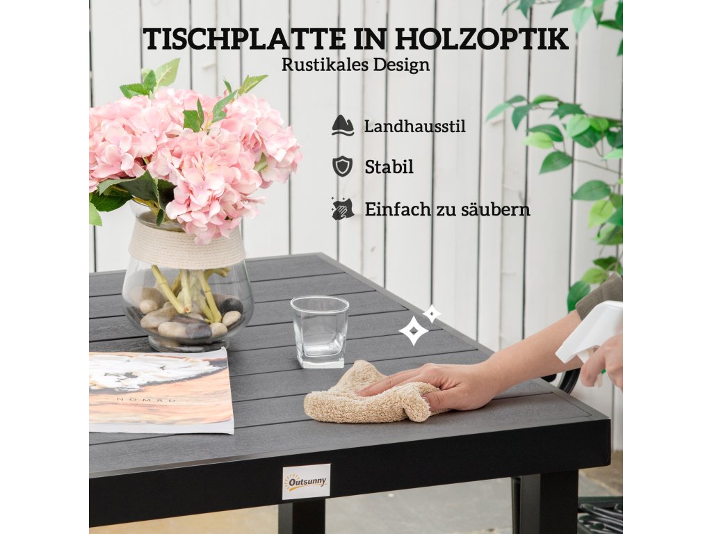 - DŘEVĚNÁ DESKA STOLU: Plastové lamely na desce stolu imitují dřevo, jsou však robustnější a odolnější. Po dešti navíc rychle schne a snadno se čistí vlhkým hadříkem.