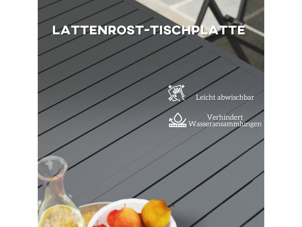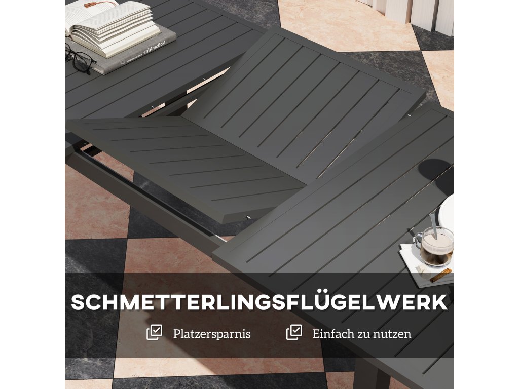 Zažijte sofistikované venkovní stolování se zahradním stolem Outsunny odolným proti povětrnostním vlivům, který dokonale kombinuje funkčnost a styl. Malý zahradní stůl se snadno rozkládá pomocí motýlkového mechanismu a pohodlně se k němu vejde 6-8 osob. Díky robustnímu hliníkovému rámu a lamelovému povrchu se zahradní stůl snadno čistí a je ideální pro každou zahradní party.