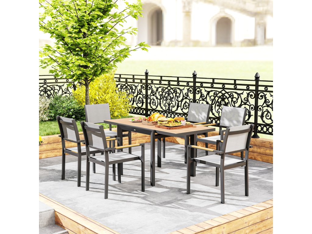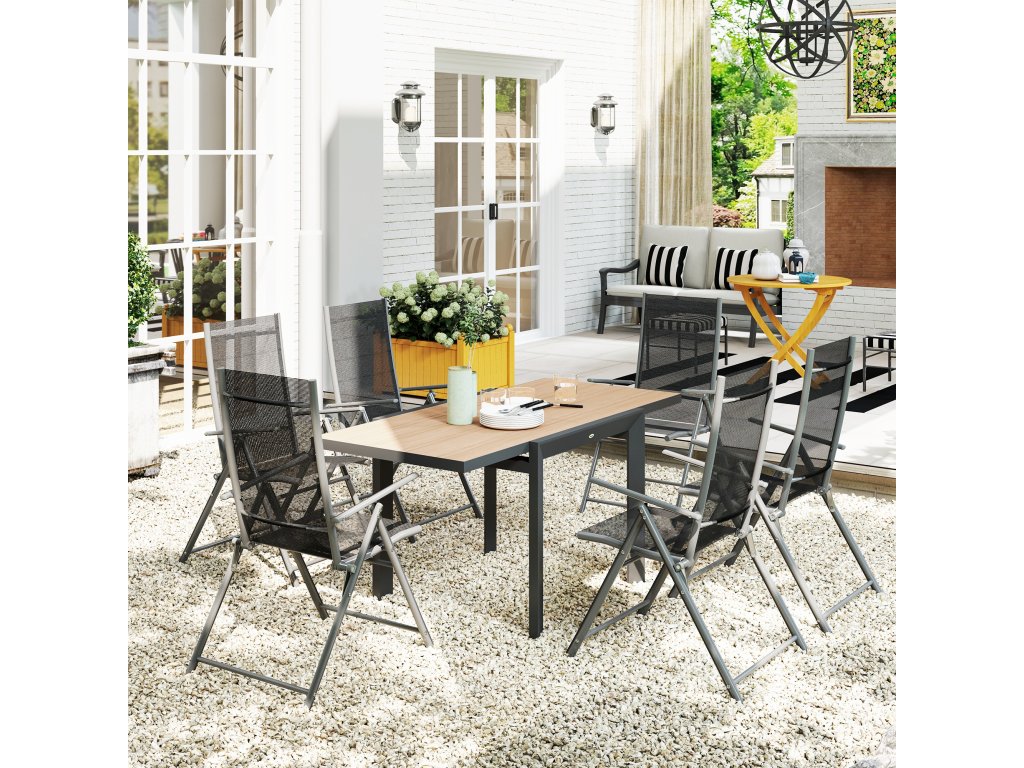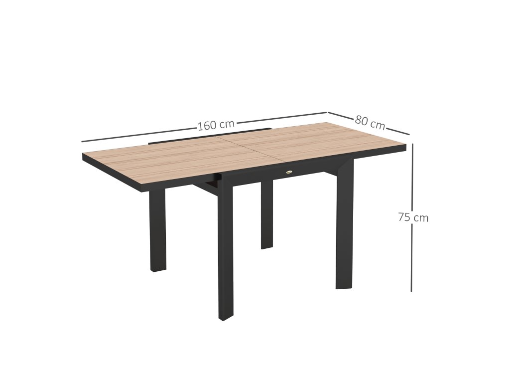 Zažijte potěšení z venkovního stolování s rozkládacím zahradním stolem Outsunny odolným proti povětrnostním vlivům. Ideální pro 4-6 osob, ideální pro malé oslavy. Vyroben z lehkého, nerezavějícího hliníku s práškovou povrchovou úpravou. Elegantní, snadno udržovatelná deska stolu se vzhledem dřeva vylepší každý venkovní prostor. Tento univerzální malý zahradní stolek ozvláštní každé venkovní jídlo.