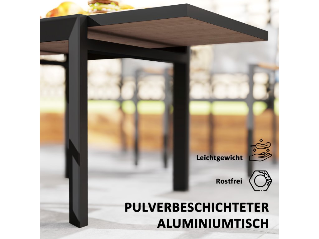 - Robustní konstrukce: Tento zahradní stůl je vyroben z lehkého hliníku s robustním práškovým nástřikem, je odolný proti korozi a ideální pro venkovní použití.